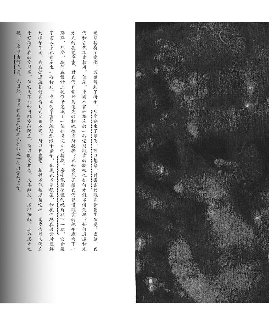 微园美术馆是由东南大学葛明老师设计的,他采用的是宋式园林的方式来做这样一座建筑。建筑是黑白的基调,书册的文字内容是葛明老师的一次访谈,设计上温习久违的竖式阅读,最大程度的还原文本阅读的质地,将中国传统的册页和手札的形式融入其中,寻找一种对比和过渡的舒适观法,这也是葛明老师在建筑上强调的观法。
