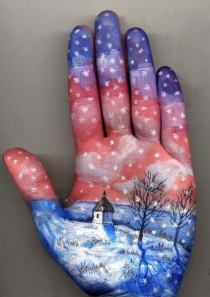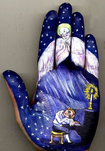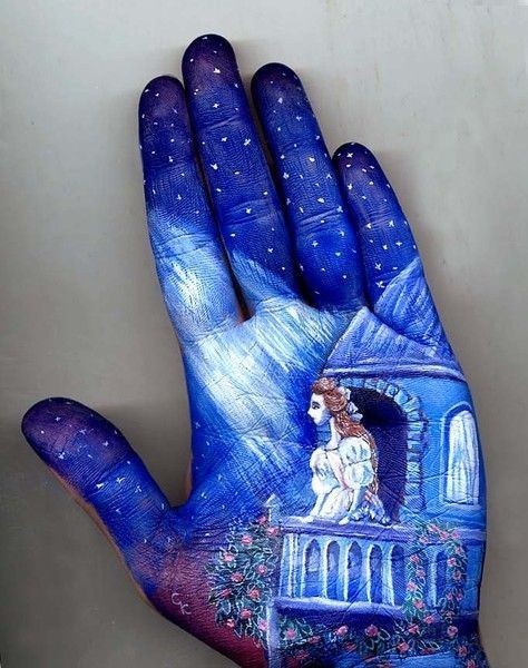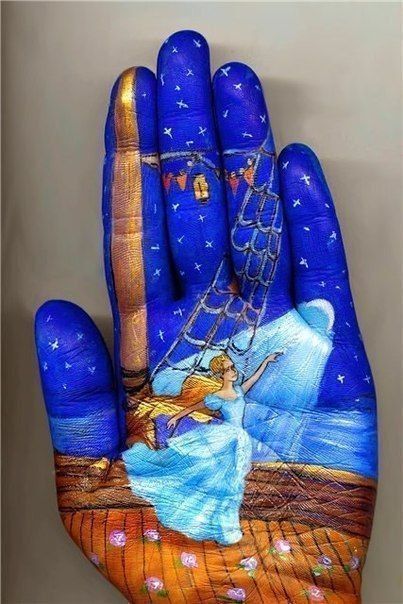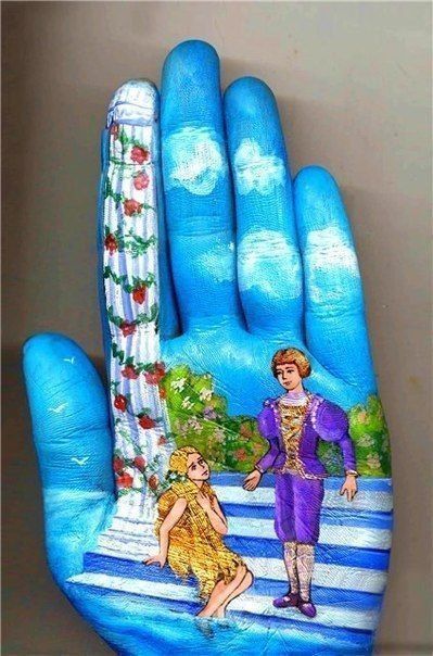 受著名童话作者安徒生、德圣埃克絮佩里等人的影响,俄罗斯艺术家Svetlana Kolosova在自己的手掌上画出了温暖的童话。她一直热爱艺术,然而要照顾四个孩子以及繁重的家务,没有时间专注创作复杂的油画。于是她改用水彩,在最容易找到的画布——自己的手掌上——画出了孩子们小时候最爱的童话。