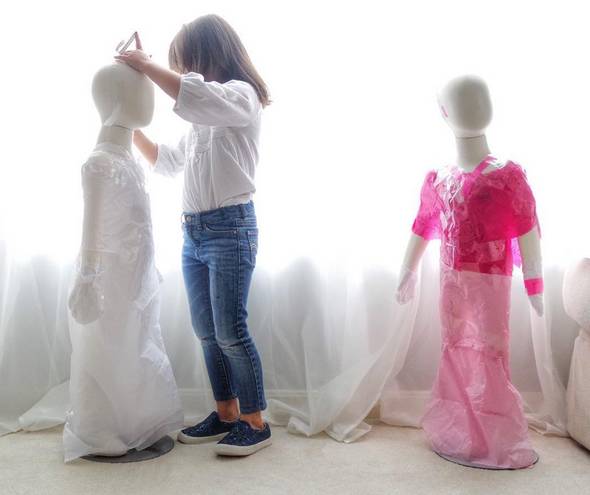 Mayhem从家里找出纸张、铝箔、缎带、床单、丝巾等物品,开始了一个服装设计师的崛起之路。