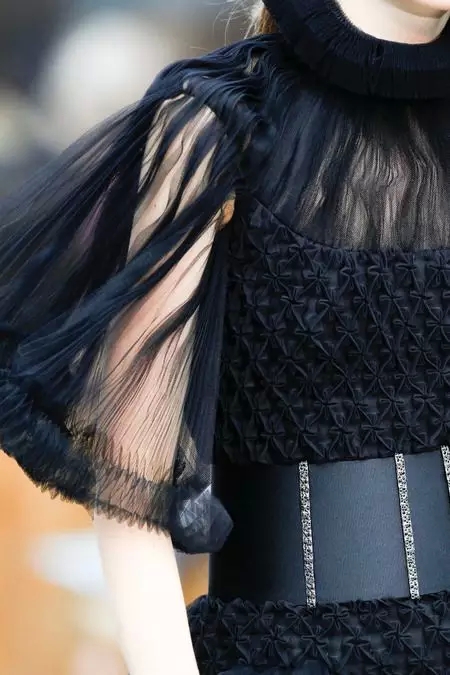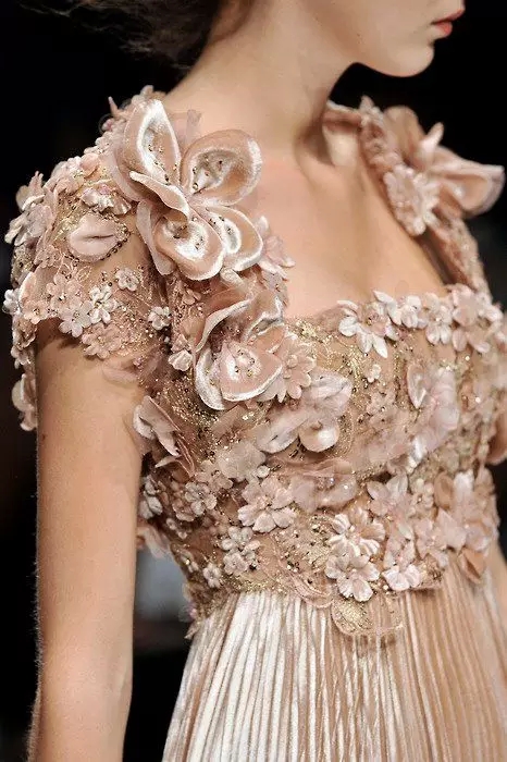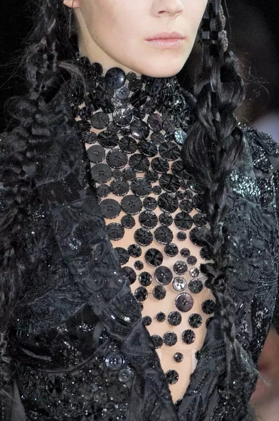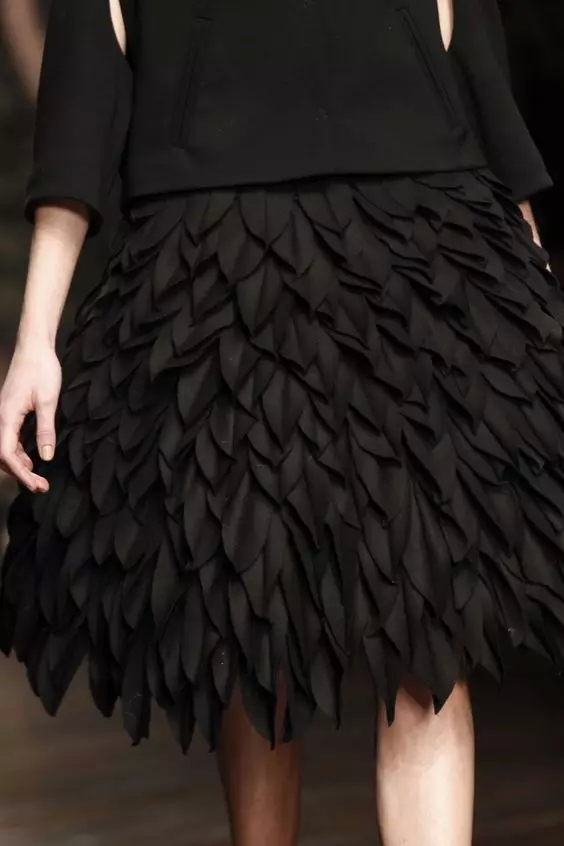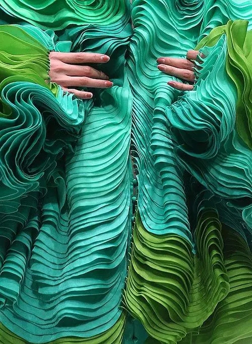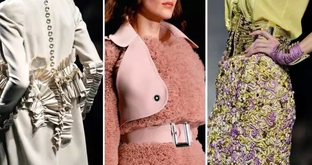 利用传统手工或平缝机等设备对各种面料进行缝制加工,也可运用物理和化学的手段改变面料原有的形态,形成立体的或浮雕般的肌理效果。一般所采用的方法是:堆积、抽褶、层叠、凹凸、褶裥、褶皱等,多数是在服装局部设计中采用这些表现方法,也有用于整块面料的。总之,在采用这些方法的时候,选择什么样的材料,用何种加工手段,如何结合其他材料产生对比效果,以达到意想不到的境界,是对设计师创意和实践能力的挑战。
