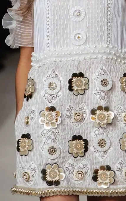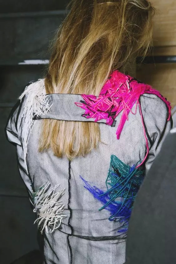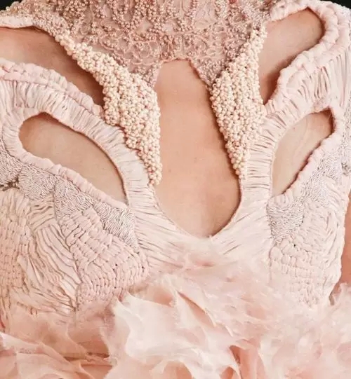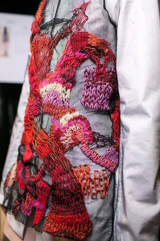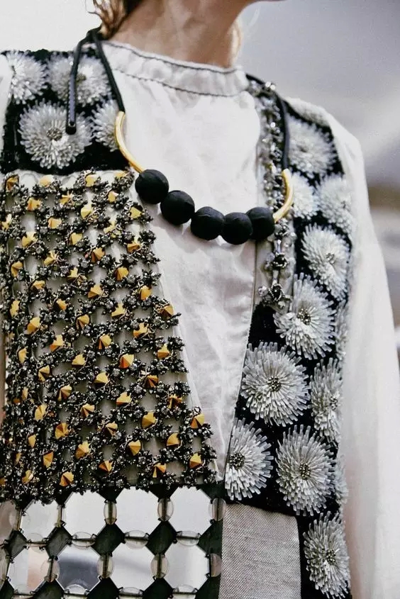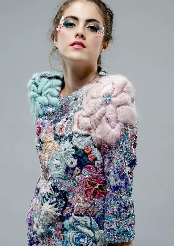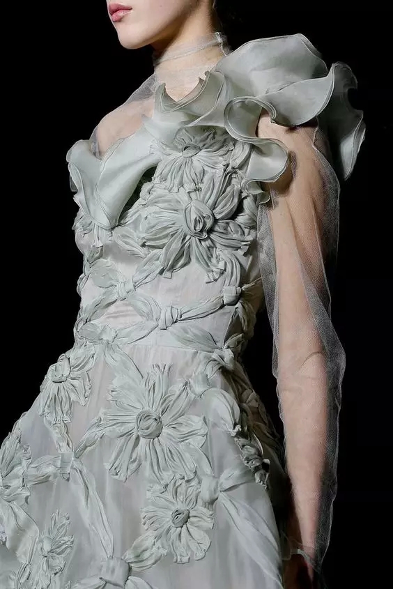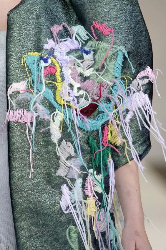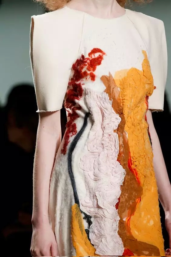 在进行面料形态设计时往往采用多种加工手段,如:剪切和叠加、绣花和镂空等同时运用的情况,灵活地运用综合设计的表现方法会使面料的表情更丰富,创造出别有洞天的肌理和视觉效果。