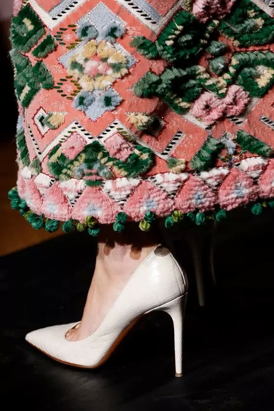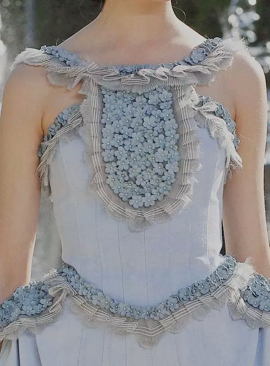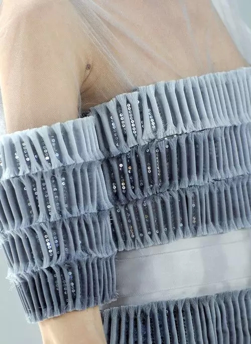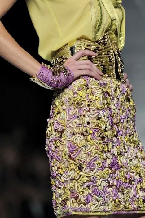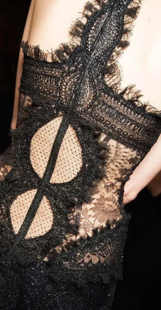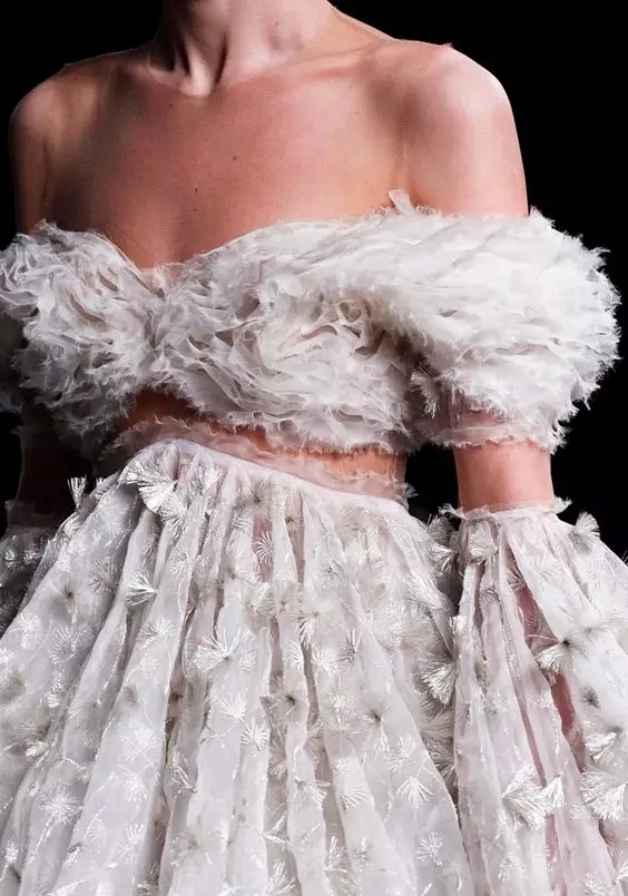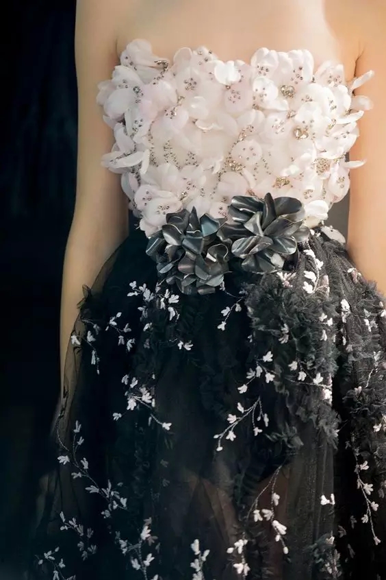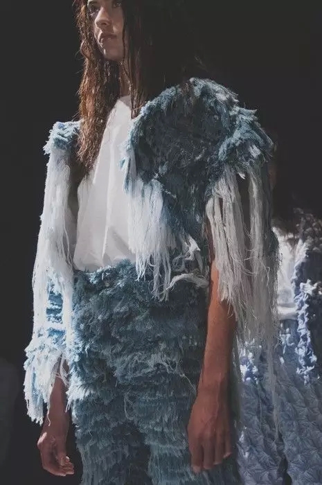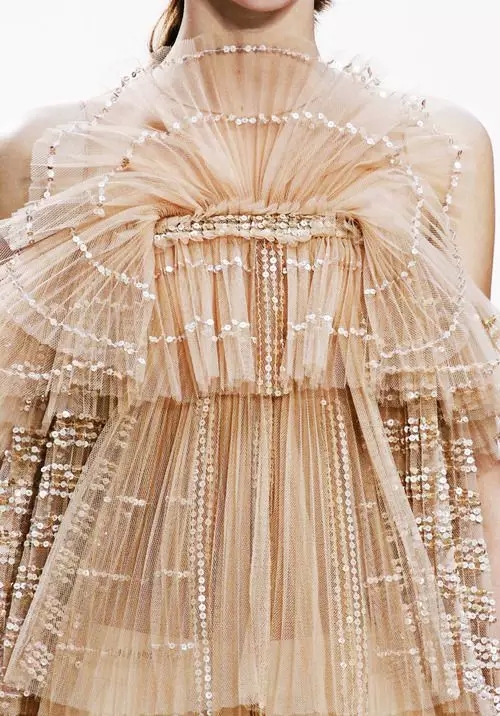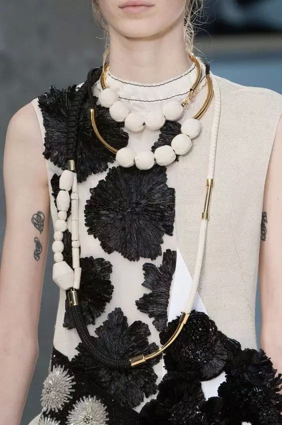 在进行面料形态设计时往往采用多种加工手段,如:剪切和叠加、绣花和镂空等同时运用的情况,灵活地运用综合设计的表现方法会使面料的表情更丰富,创造出别有洞天的肌理和视觉效果。