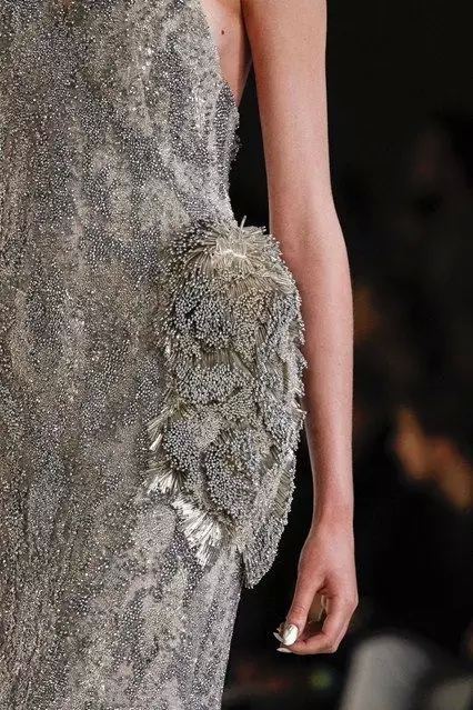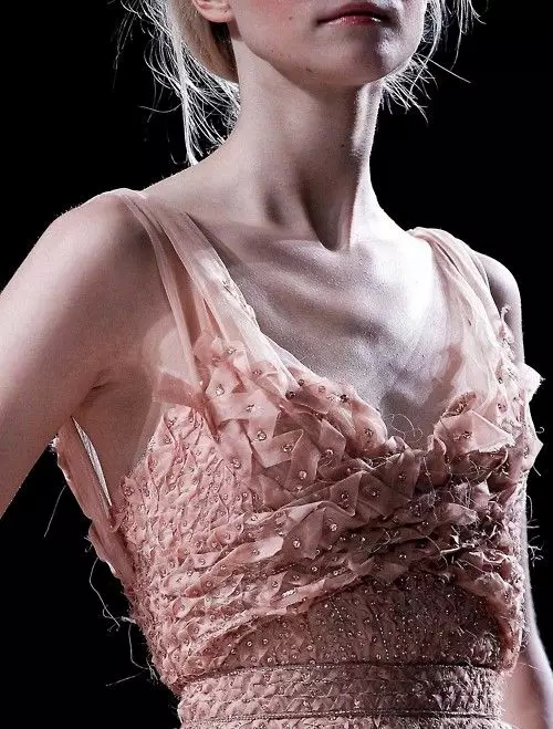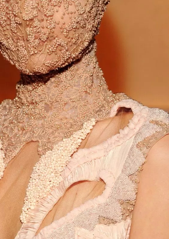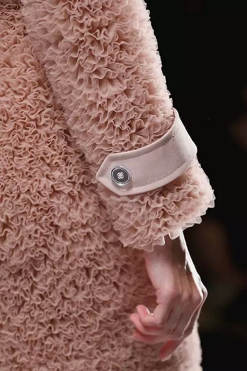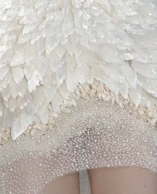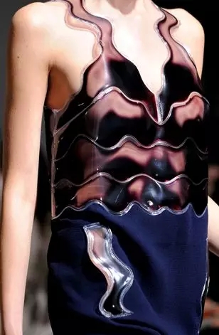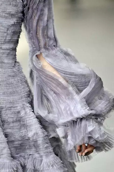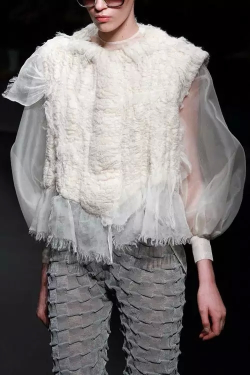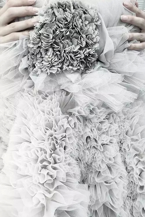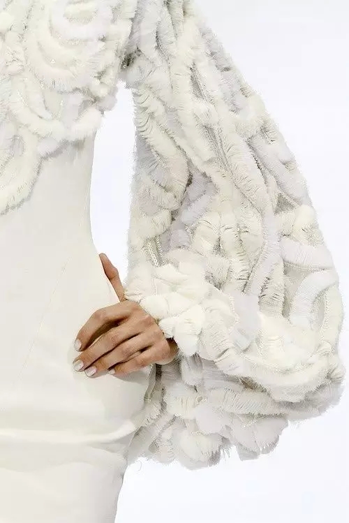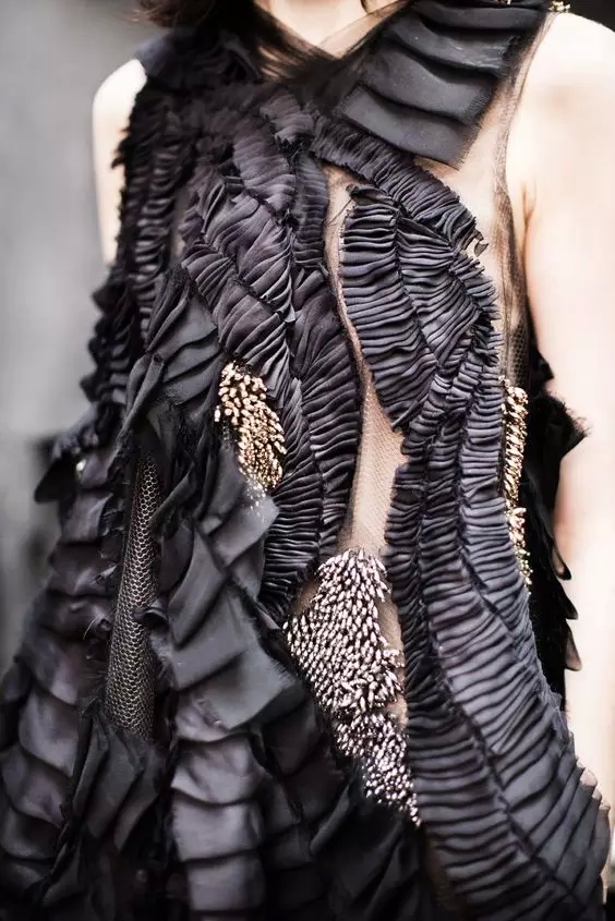 服装面料的形态美感主要体现在材料的肌理上,肌理是通过触摸感觉给予的不同的心理感受,如:粗糙与光滑,软与硬,轻与重等,肌理的视觉效果不仅能丰富面料的形态表情,而且具有动态的、创造性的表现主义的审美特点。因此,从服装面料的肌理的运用和表现上,可以直接看到设计师的观念表达是否准确到位。
