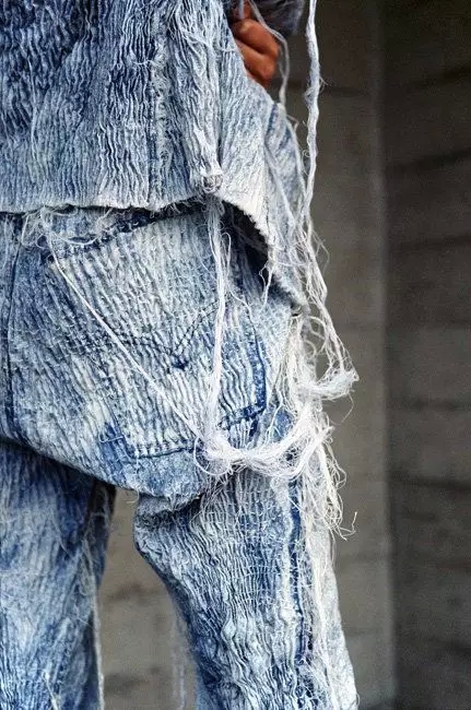 按设计构思对现有的面料进行破坏,如:镂空、烧花、烂花、抽丝、剪切、磨沙等,形成错落有致、亦实亦虚的效果。