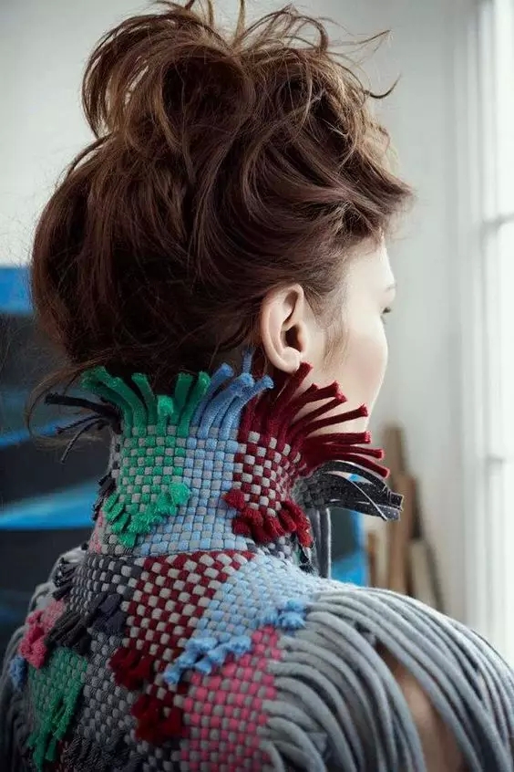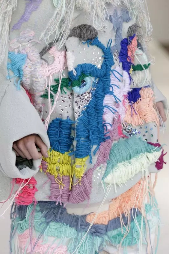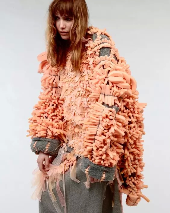 各种各样的纤维和钩编技巧,随着编织服装的再度流行已日益成为时尚生活的焦点,以不同质感的线、绳、皮条、带、装饰花边,用钩织或编结等手段,组合成各种极富创意的作品,形成凸凹、交错、连续、对比的视觉效果。