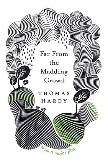 同《德伯家的苔丝》一样,哈代早期作品《远离尘嚣》也将故事背景设置在英格兰村镇多塞特郡。在这一版本的封面中,农场的一切都尽收眼底,大地、天空、树木、牛羊、雨滴。