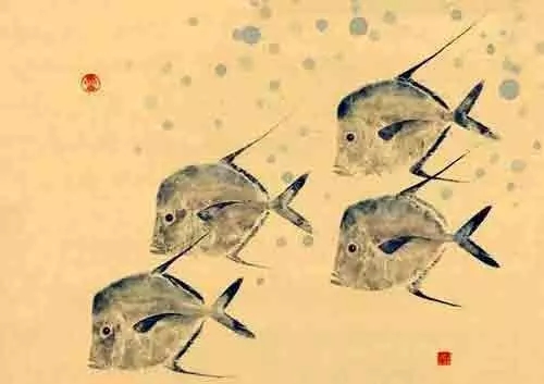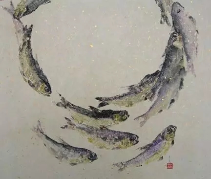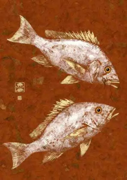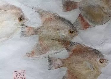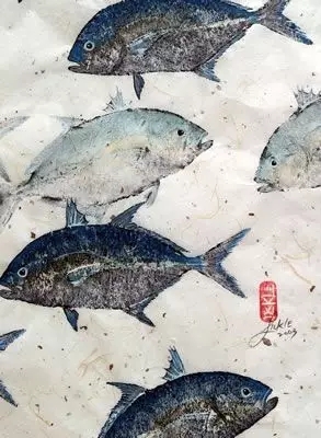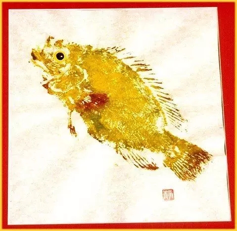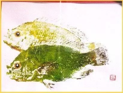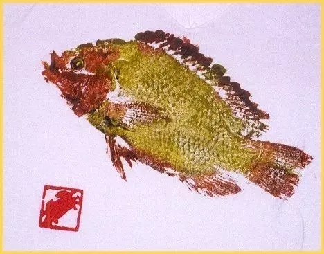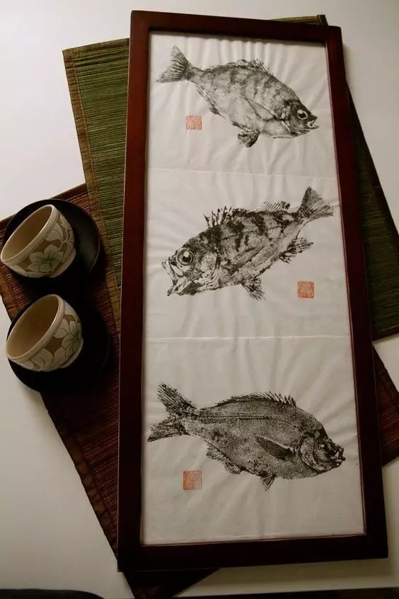 鱼拓作品上面可以描绘水草或山水,书法或题写诗词,钤盖印章,形成诗书画印的艺术品。将鱼拓作品装裱好放入镜框悬挂在家中是非常好的装饰,同时又具有纪念意义。