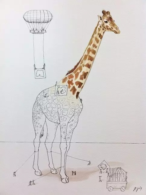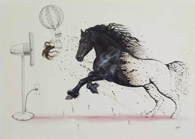 微小的人物和巨大的动物,这一切仿佛发生在《格列佛游记》里的小人国。小人们根据不同动物的特点,采用相应方法来塑造它们。例如这匹漂亮的黑色马儿就叫“Made of Wind”。小人们把颜料泼洒到半空,让风将颜料吹向马儿,创造出奔马的形象。