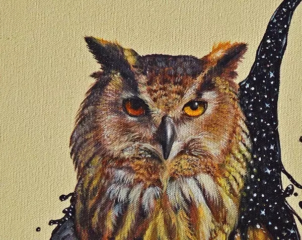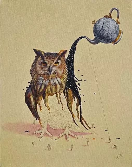 又如这只名为“Night Creature”的猫头鹰,则是由星空染色而成。小人们拉动空中的“月球壶”,闪耀着繁星的浓稠液体倾斜而出。