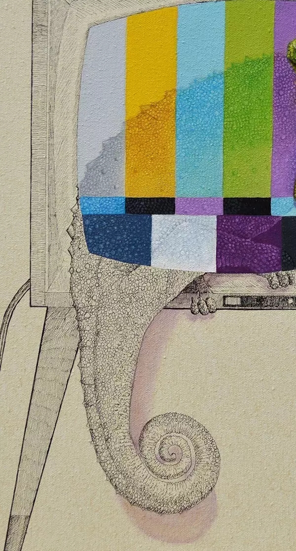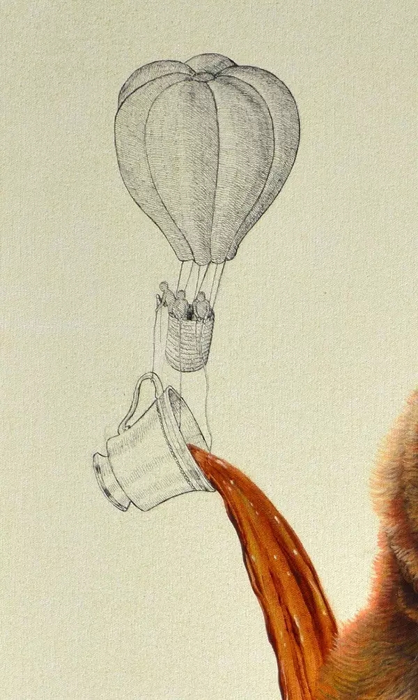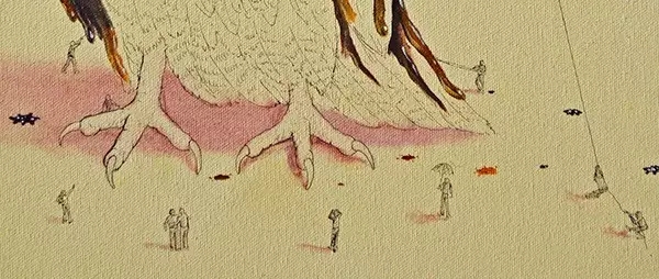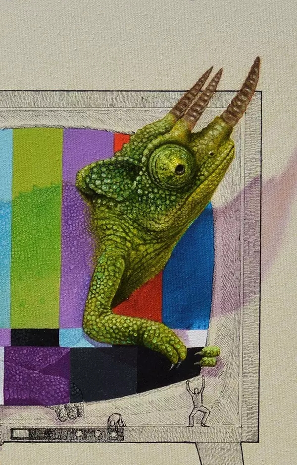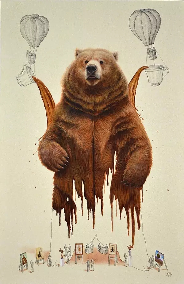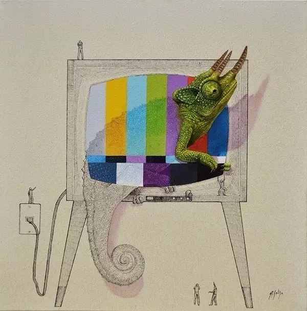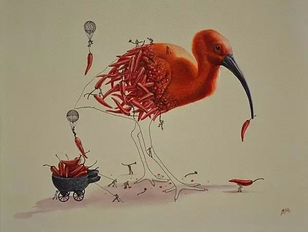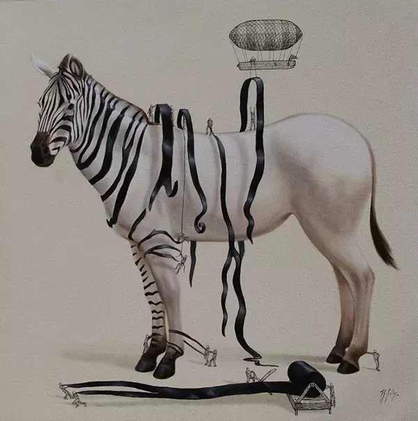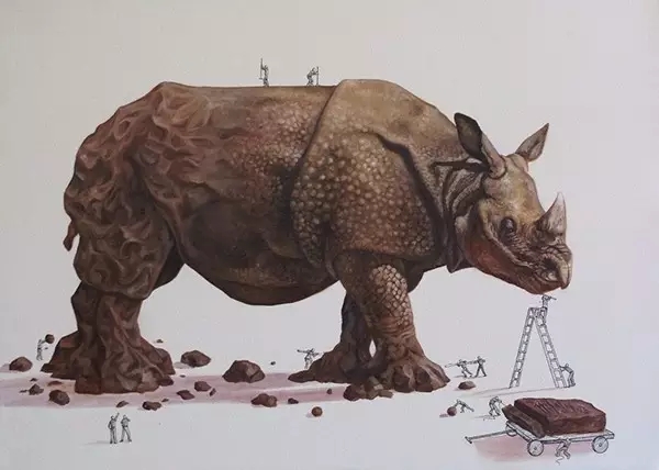 墨西哥艺术家Ricardo Solis重新思考了有关生命起源的预言和进化理论。在他的绘画作品中,动物们全部都由小于自身体积千百倍的人物打造而成。