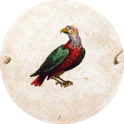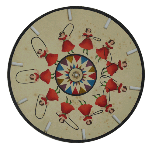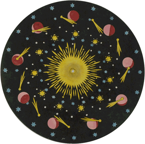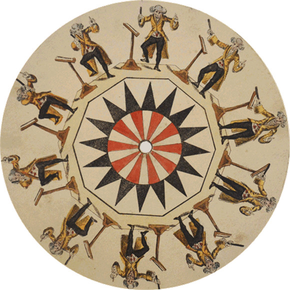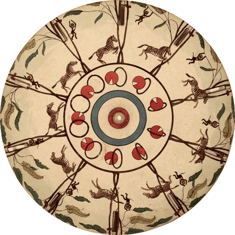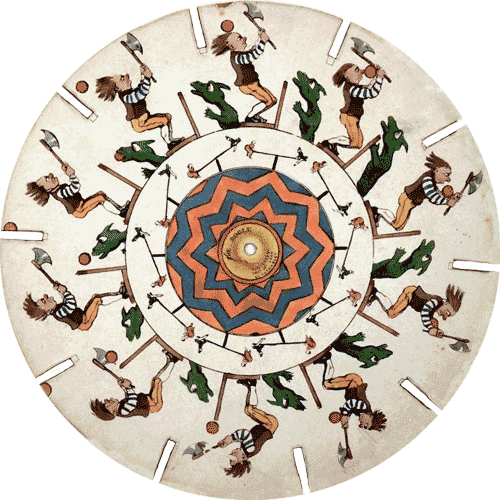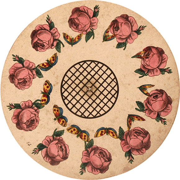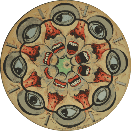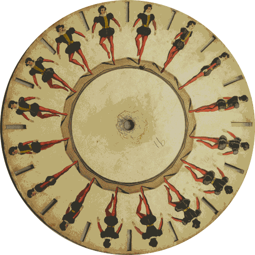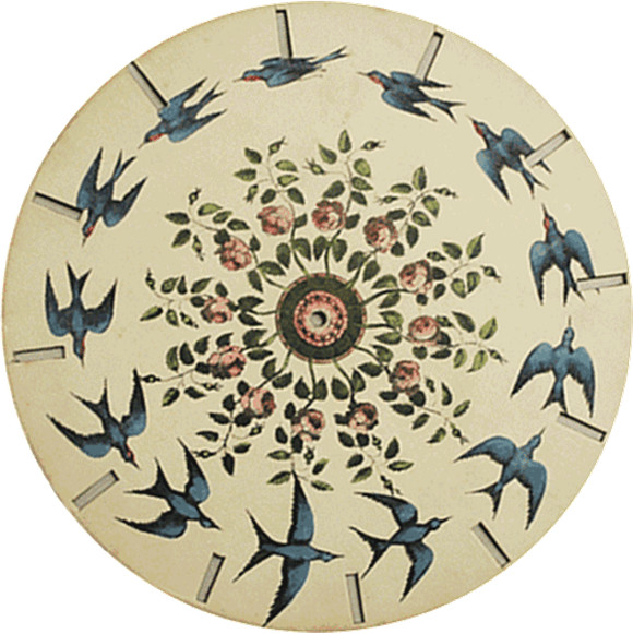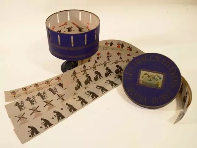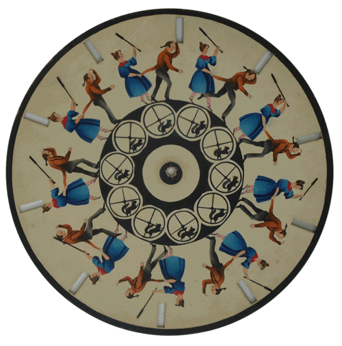 该装置由一枚带有16格画面的圆盘构成。人们看向里面的镜子时,要转动圆盘,随后盘上的裂缝便像百叶窗一样运转,将静态的图画变得栩栩如生。