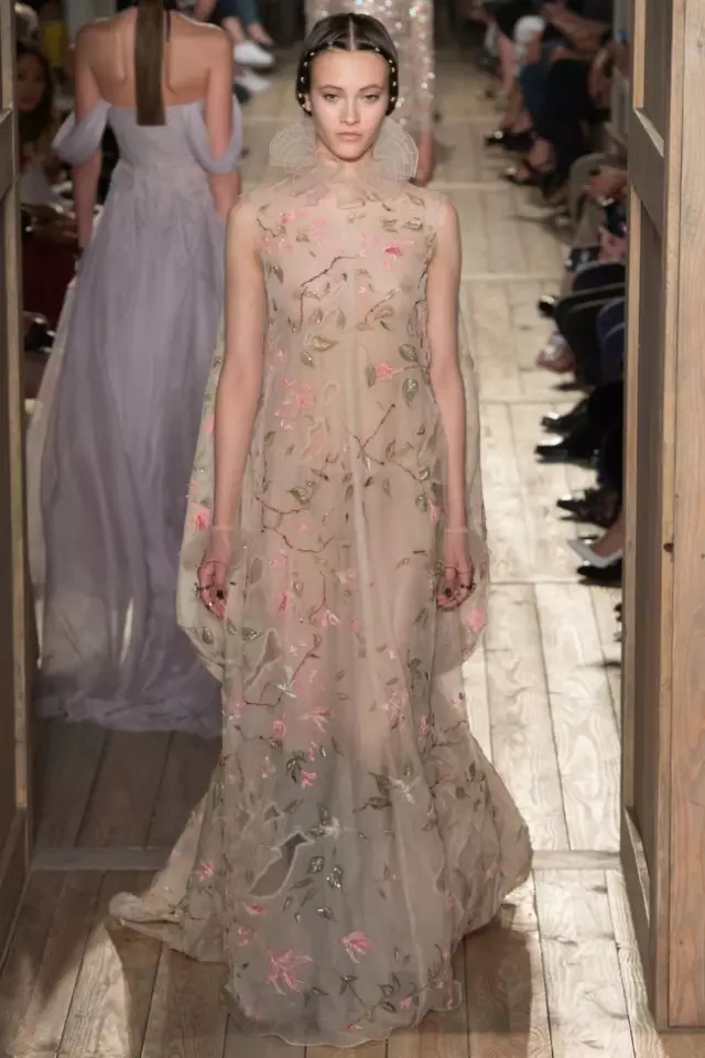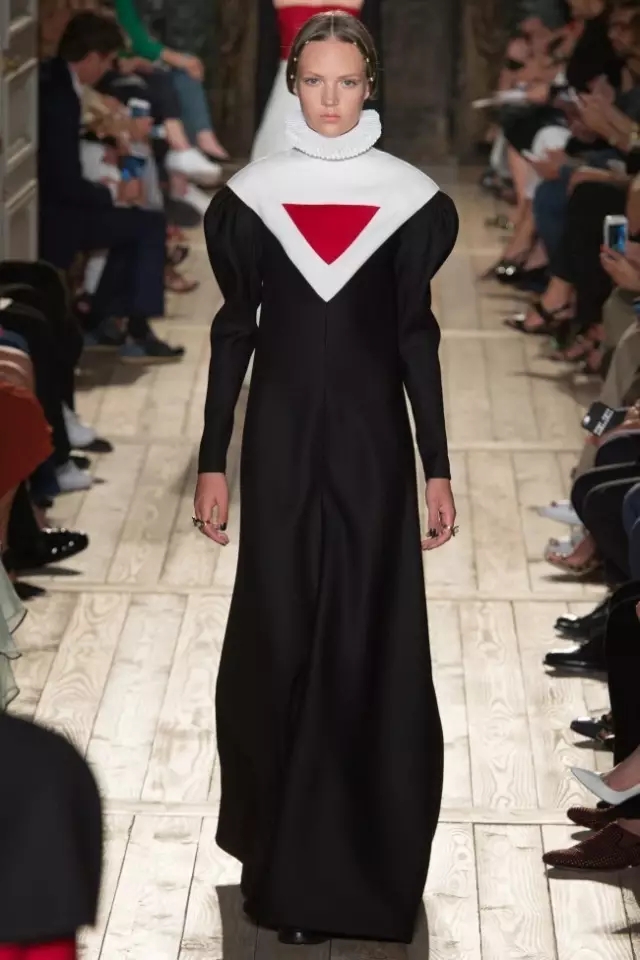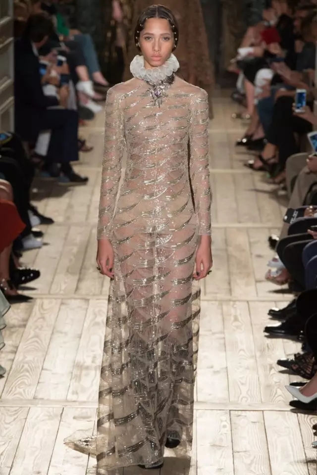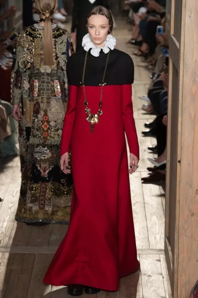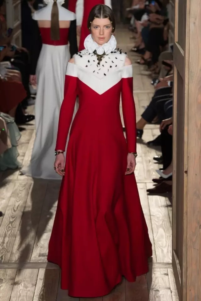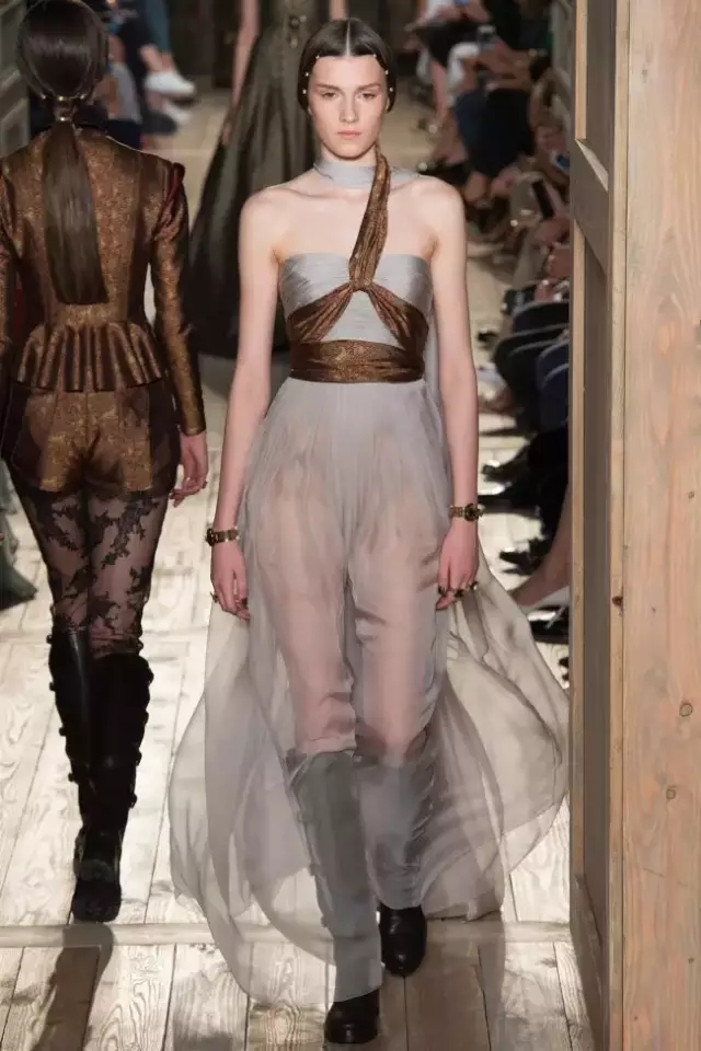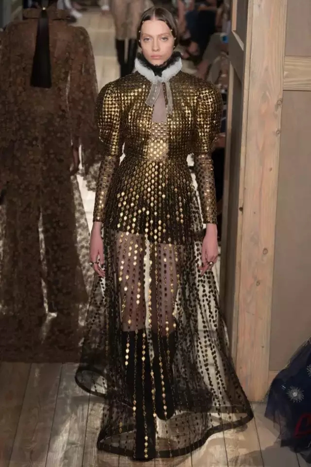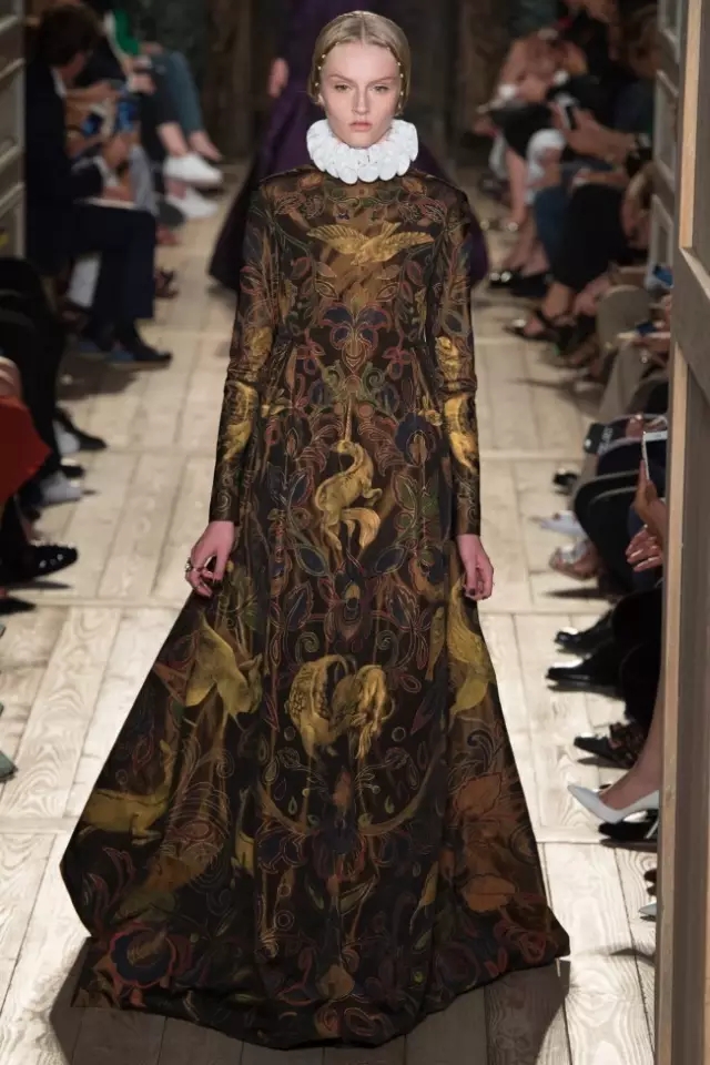 仙女系的Valentino,这次有些回到地球的感觉,但却也不是地球上的凡人,而是女王,一切就像是吟游诗人的戏剧,文艺复兴时期意大利的《罗密欧与茱丽叶》、《威尼斯商人》、《维洛那二绅士》……,Valentino 2016秋冬的高级定制服,从大文豪莎士比亚的剧作汲取灵感,模特儿身上那一套套华服,就像是为这些浪漫的剧本而打造的。