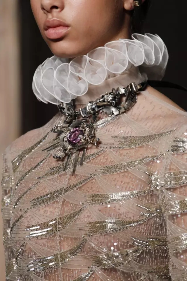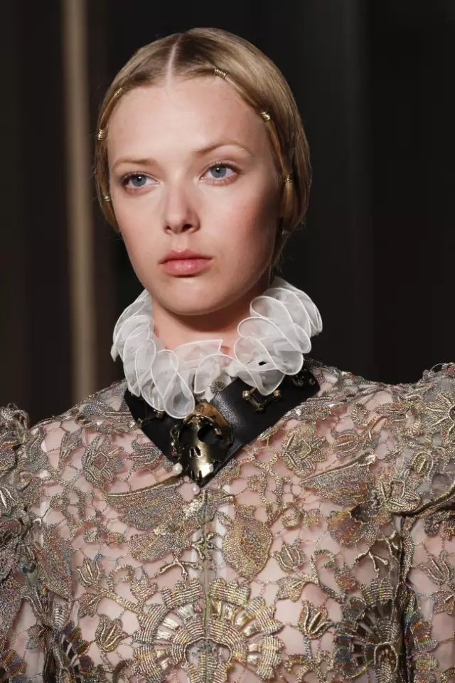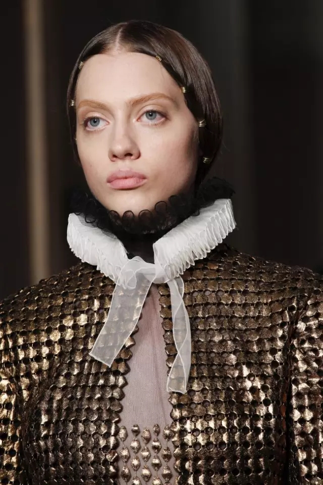 伊丽莎白女王 层层的领饰让人联想到伊丽莎白女王,拉近一看,这些领饰几乎每个都不一样,拥有多种款式,在搭配上更充满 Valentino 式柔美的强悍,细致而浪漫的领饰,搭配上粗旷的金属或皮革项链,女王不愧是女王,咄咄逼人。