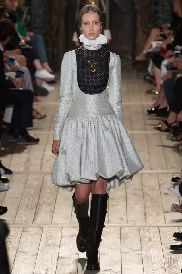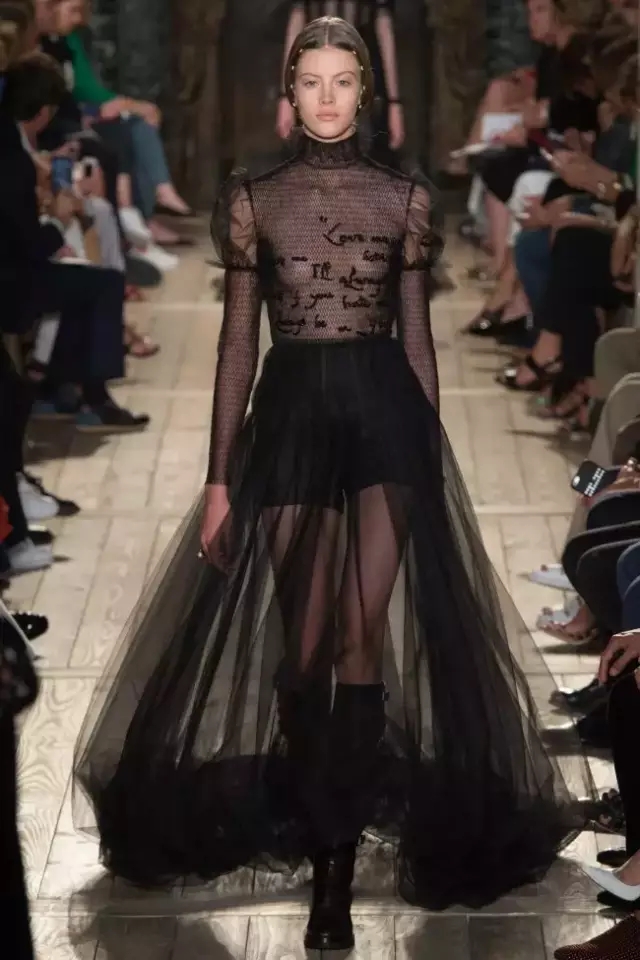 礼服配靴子 更有趣的一个现象,就是这一次高定大秀上的所有服装,搭配的都是及膝的长靴,不论是将裤管塞进,还是搭配短裙,甚至是薄纱长礼服也是这样的搭配,Valentino 提倡的新式穿搭,让其一贯的优雅,又增添了个性。