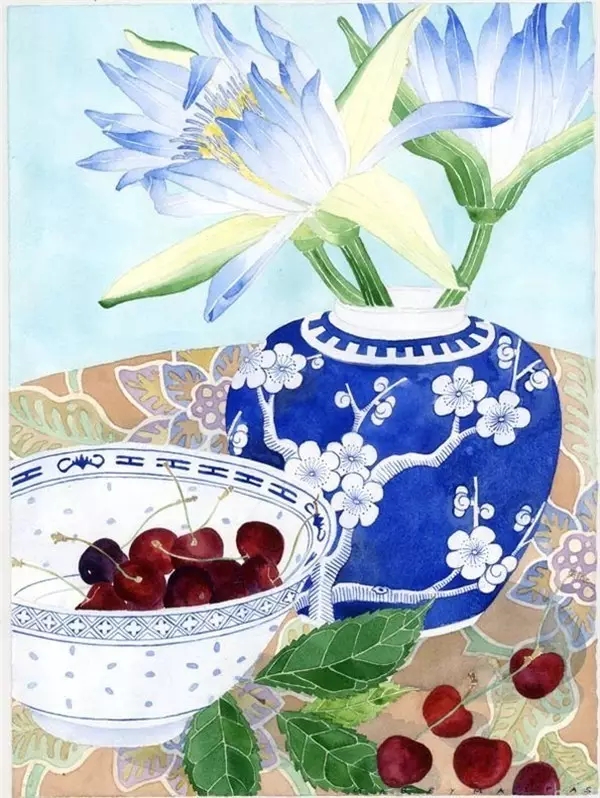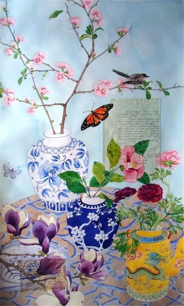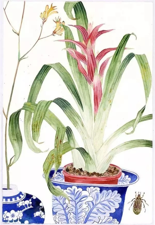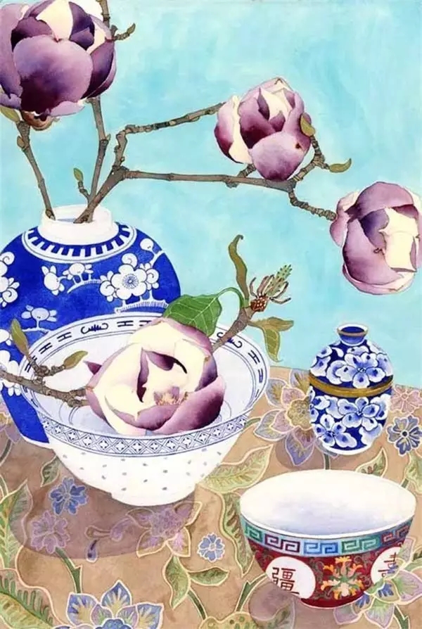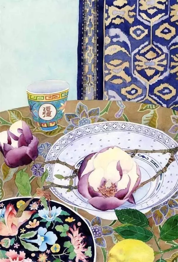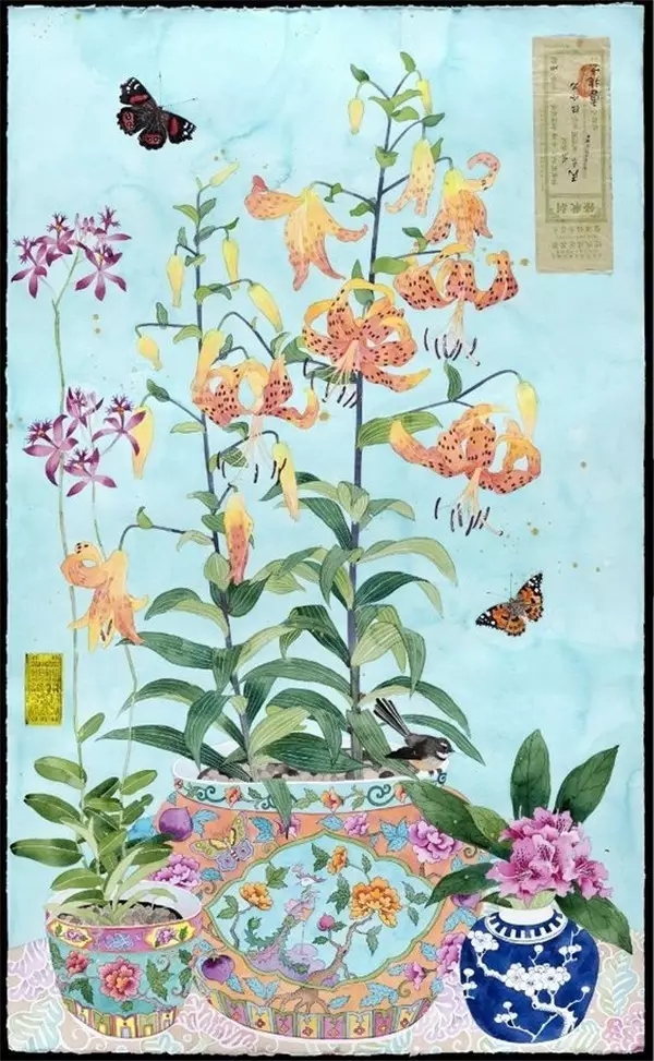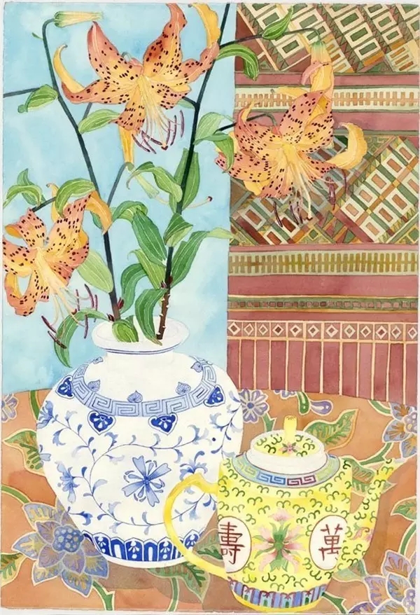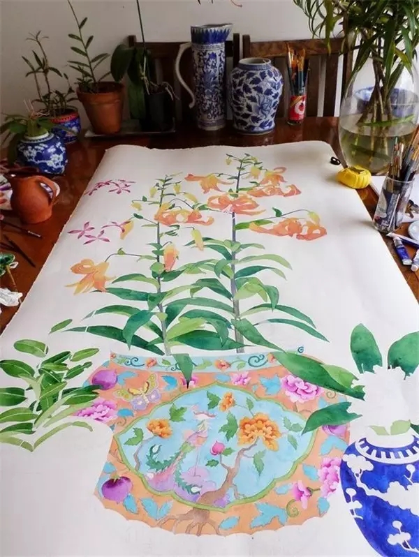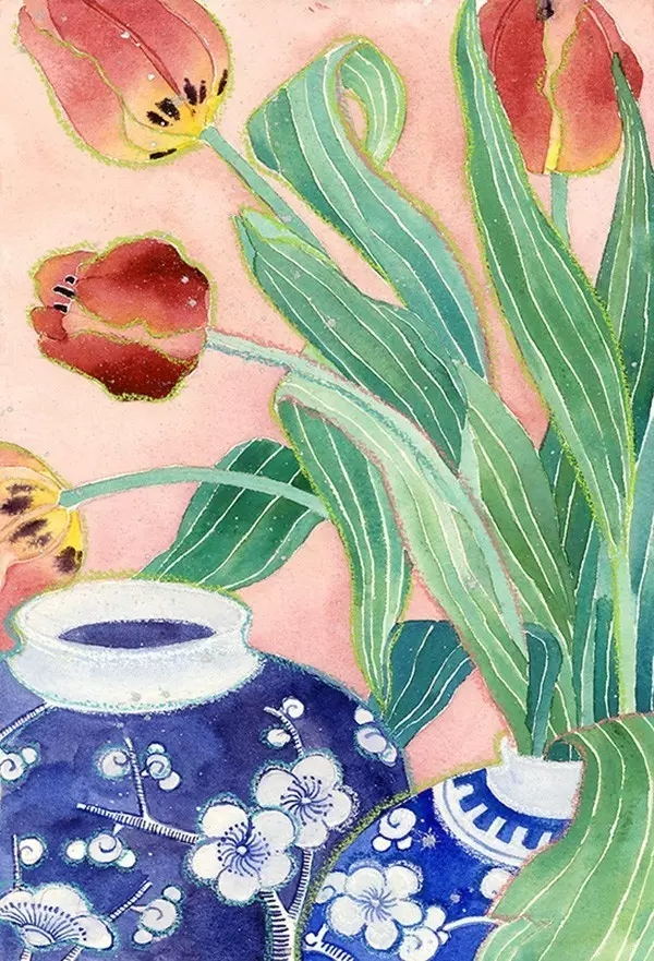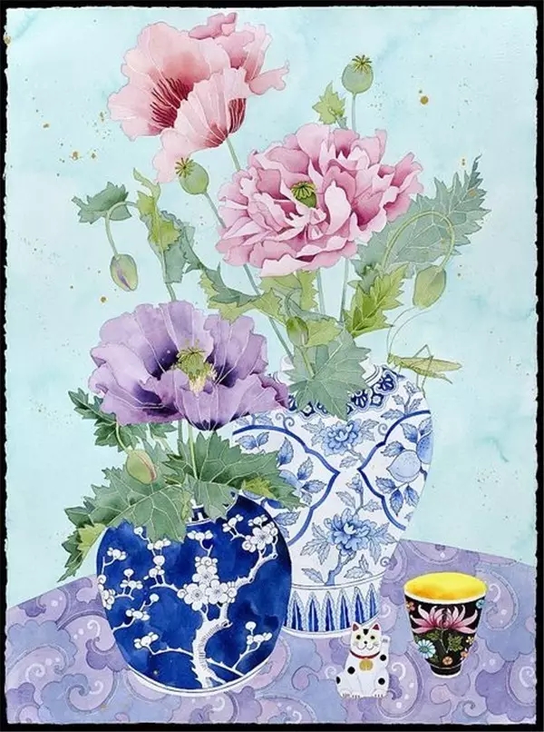 来自新西兰的艺术家Mango Frooty本是陶瓷专业出身,但一直对水彩画有着浓厚的兴趣,她将自然中的植物花卉,从叶脉枝桠,到花蕊根茎,都描绘得丝丝入扣,或清新淡雅,或浓烈热情,再和周边富有中国特色的花瓶瓷器相搭配,竟然营造出我们所熟悉的中国味道,清丽雅致。