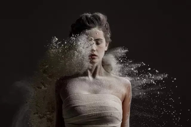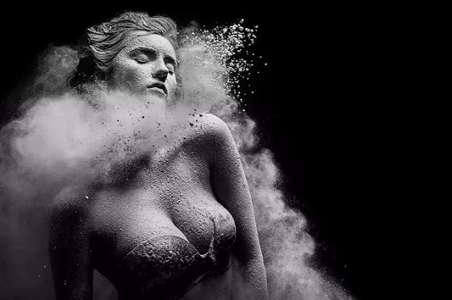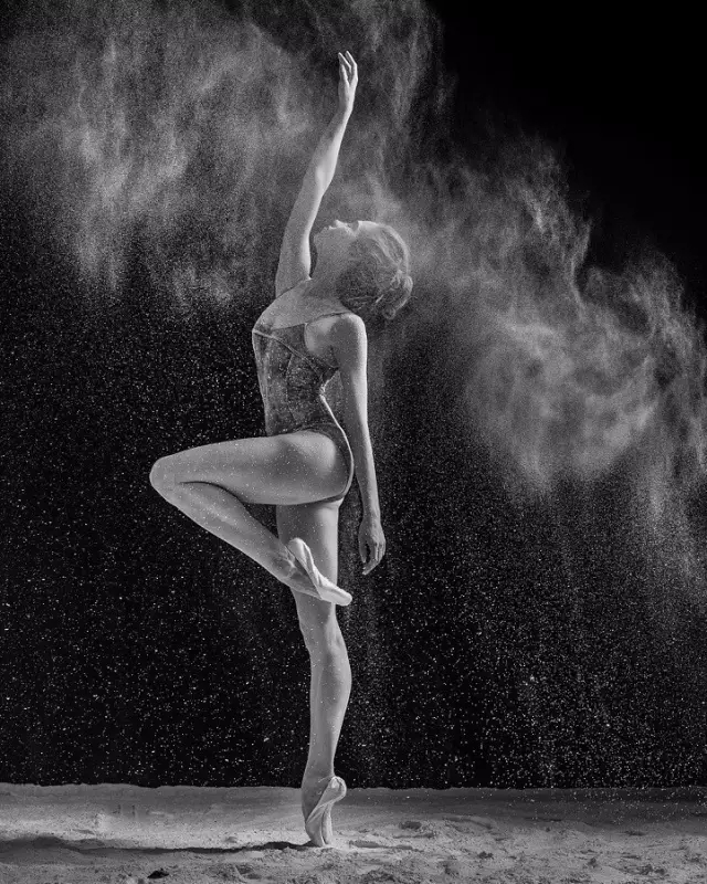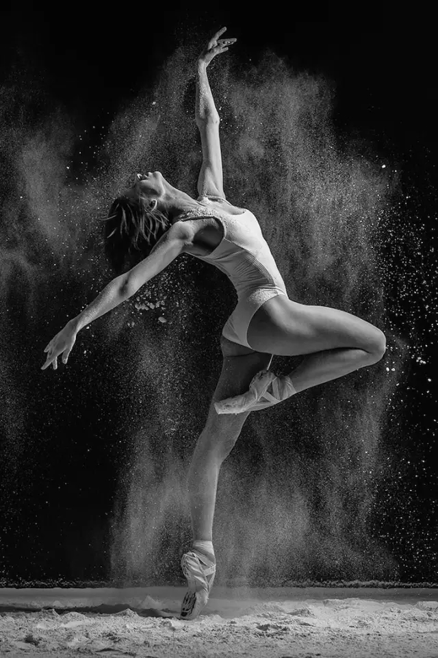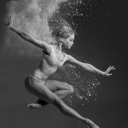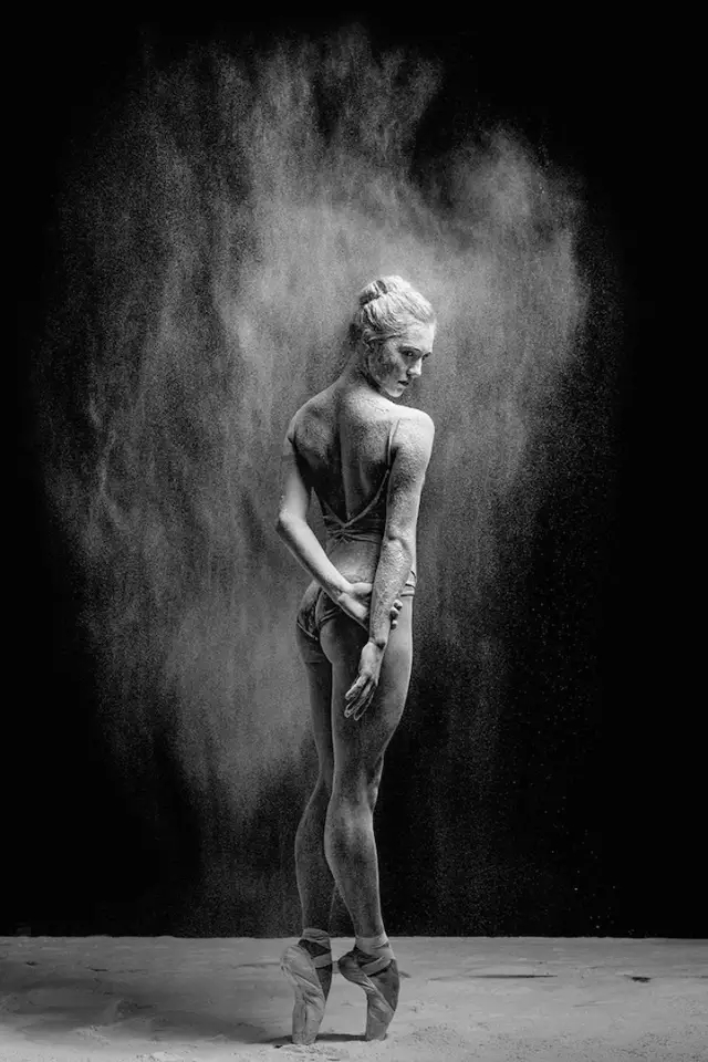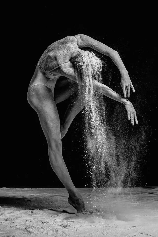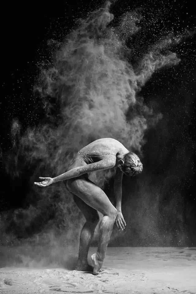 艺术家在拍摄过程中采用了面粉的简单元素,面粉在半空中漂浮,映射出每个肢体的运动路径。