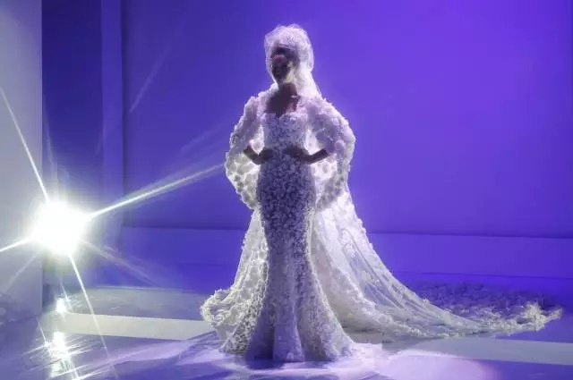 这件鱼尾婚纱运用了3D技术,缀满立体花朵,还有Bling Bling的珍珠和水晶钉珠。