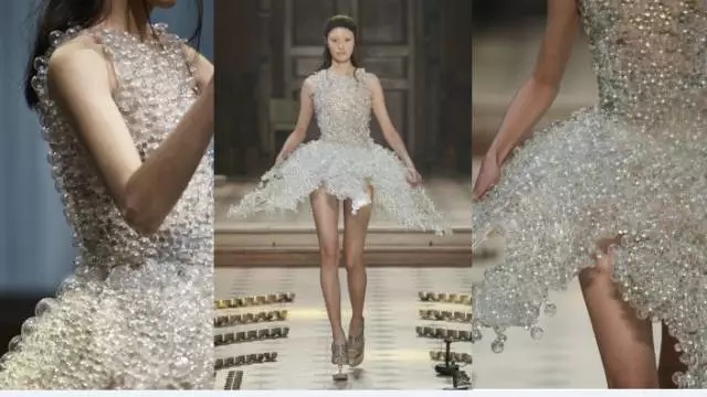 数不清的泡泡围绕在身边,构成一条连衣裙,想必这位姑娘也是幸福感满满。这些玻璃气泡由人工吹制,整条连衣裙则由透明硅树脂制作。