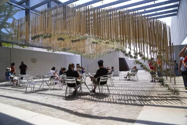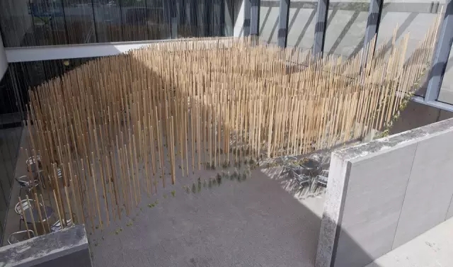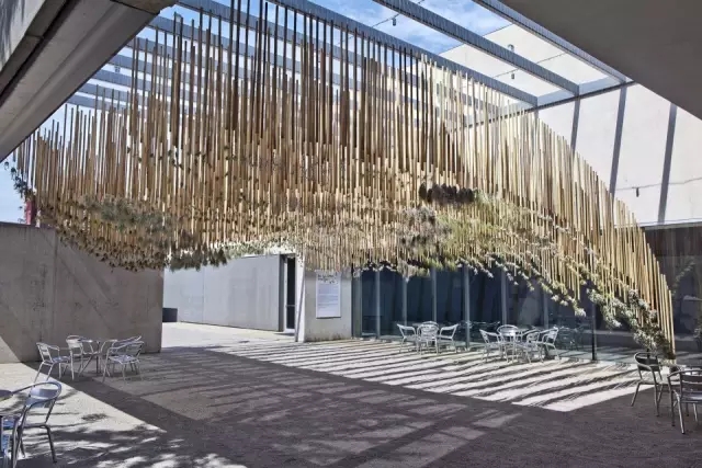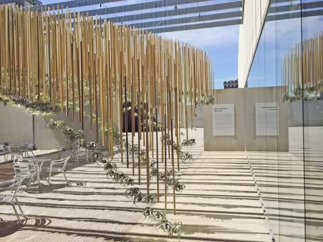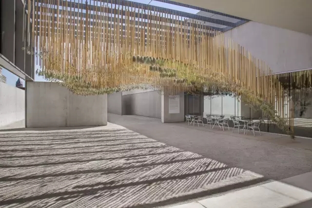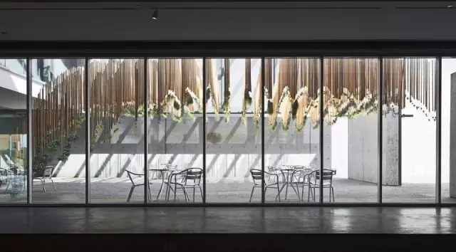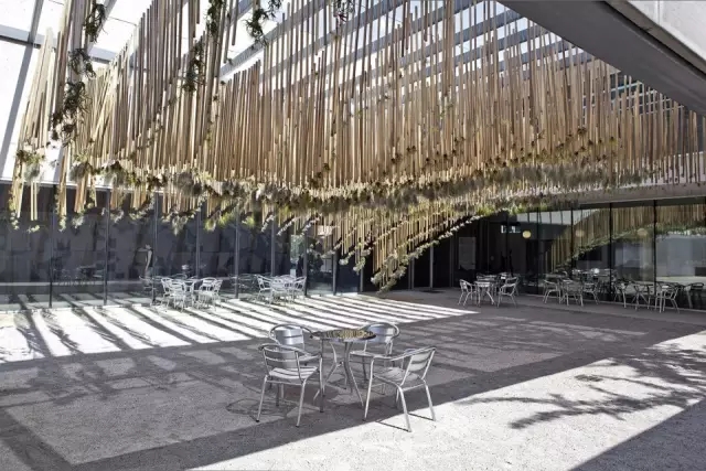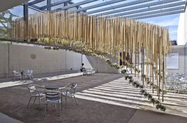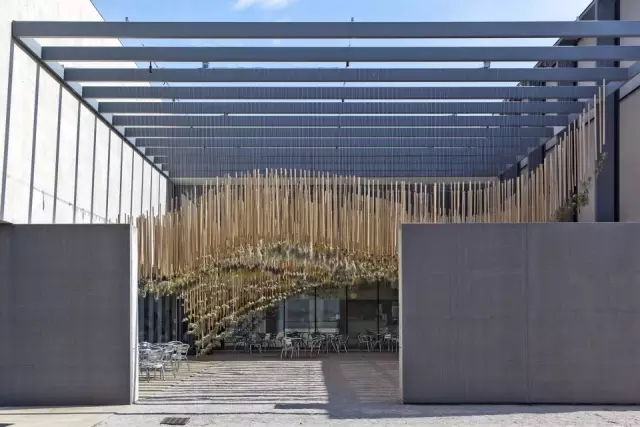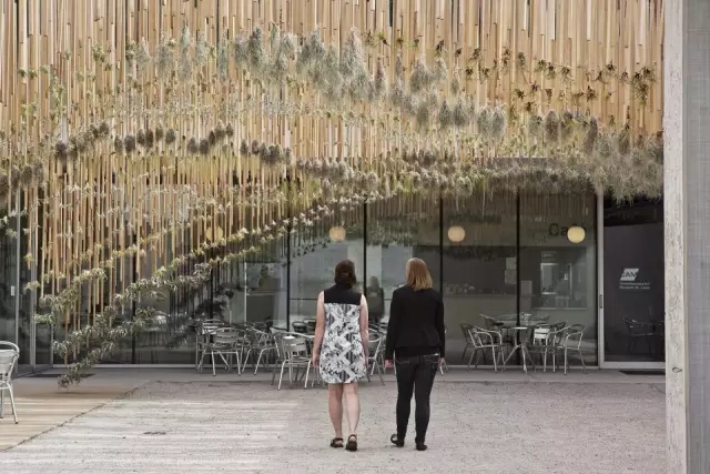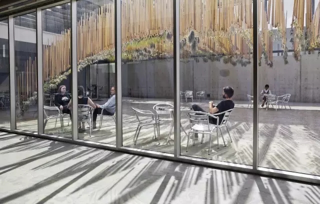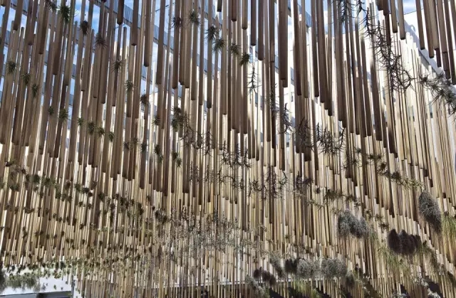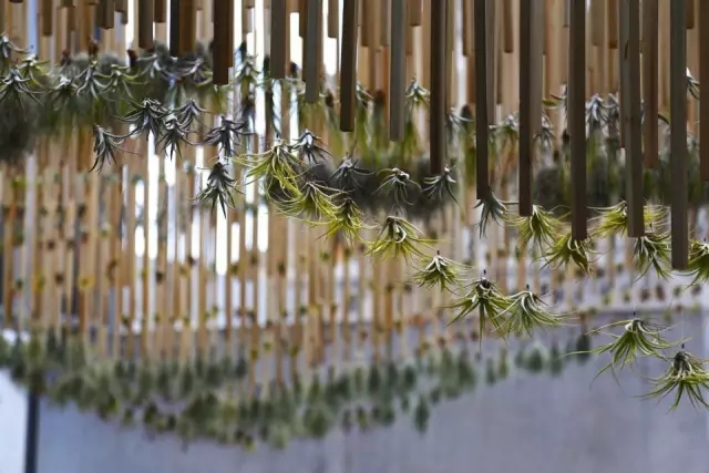 数以千计的铁兰倒挂在悬于铁制顶棚的回收木条之上,如同超生物体般摇摆起伏,“绿色空气”营造出一个层次丰富却又井然有序的空间。这个装置给位于博物馆心脏地带的中庭带来了极富感染力的巨大变化,雕塑般的空中花园在参观者的上方随着微风轻轻摇摆,在地面上留下了细密而交错的阴影。