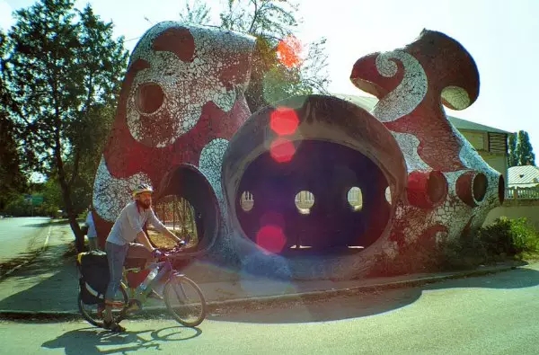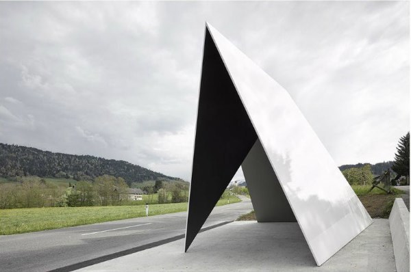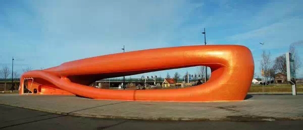 加利福尼亚州令人费解的弯曲公交站Dennis Oppenheim设计,扭曲的曲线延伸出一所房子,寓意是提醒乘客,很快就会到家啦!