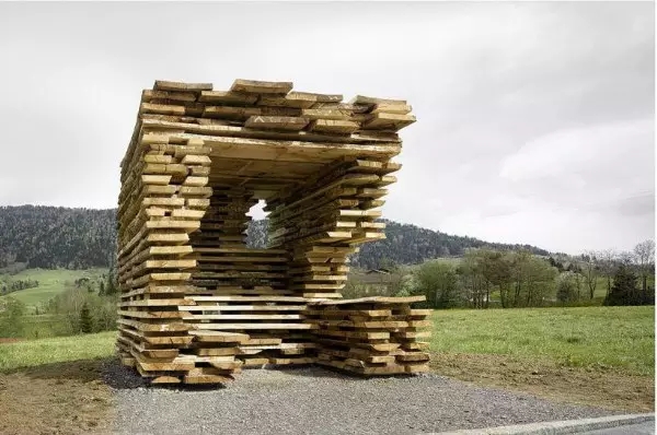 西班牙Ensamble工作室的公交站是用堆叠的木板转换成一个建筑空间。