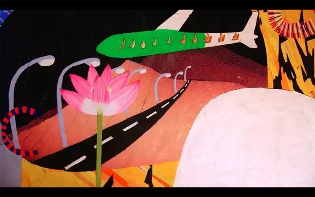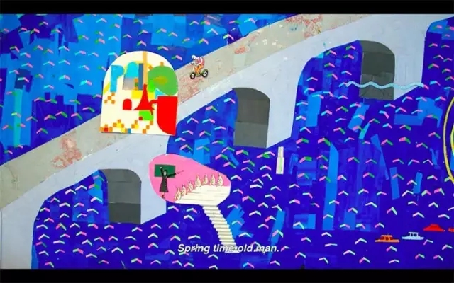 这部短片中呈现了一个由多种欢乐形象进行拼贴的世界,这个饱和度极高的彩色世界被各种质感、手画元素占领,这中间紫色的山和蓝色的鱼额外醒目。