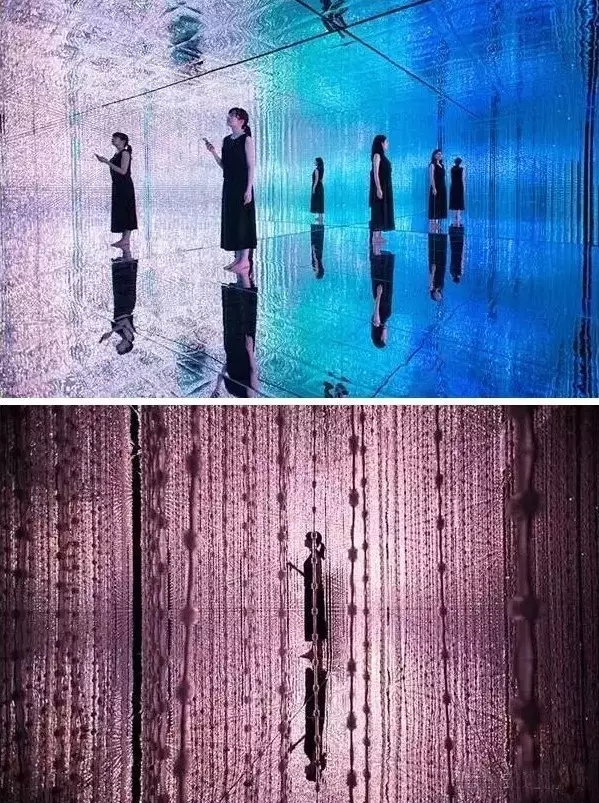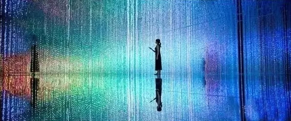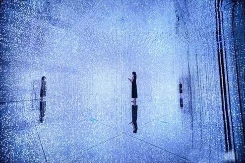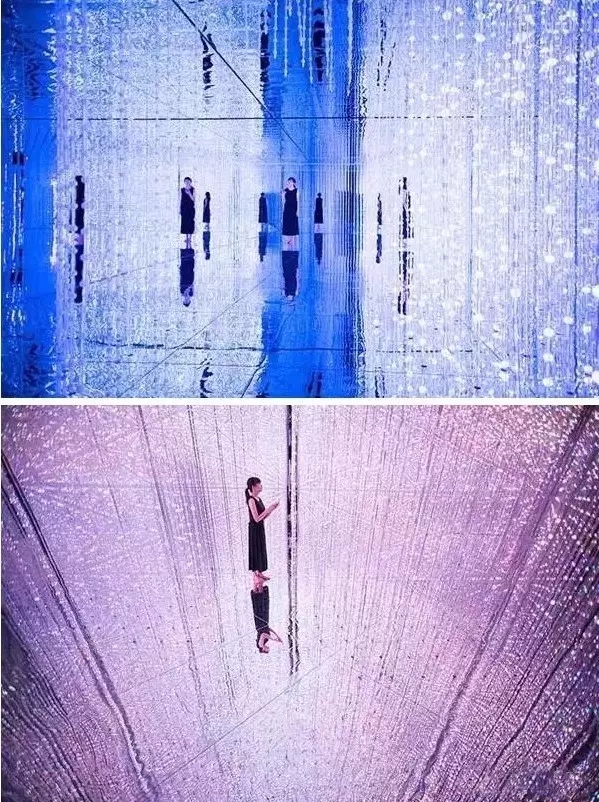 日本创意团体TeamLab,设计了一个3000平米虚拟体验的结构化迷宫,命名《Wander through the Crystal Universe》(漫步在水晶宇宙)。这件作品采用累积光点进行创建,白色、紫色、蓝色等不同颜色的点构成一幅点彩派图画。在“水晶宇宙”中,光粒子由数字控制,并根据观众的互动情况而改变,游客走在众多颜色交织的线条中,感受BlingBling的视觉体验。