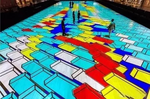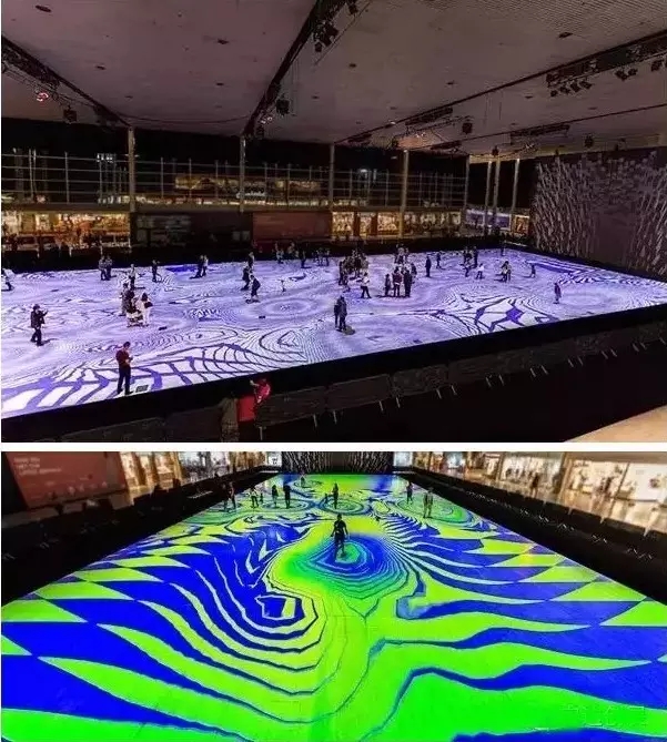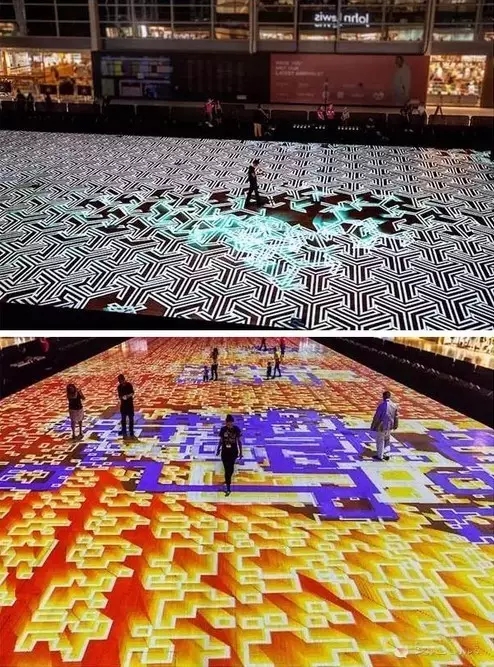在英格兰中部城市米尔顿·凯恩斯,以互动装置和钟情于投影闻名的艺术家Miguel Chevalier,设计了一个面积达1200平米的互动式艺术作品——“魔法地毯2016”,将地面变成了五彩缤纷的大魔毯。通过将千变万化和丰富多彩的图案映射到地面,让游客在地毯形状的影像上移动,感受完全沉浸式的互动体验。这个命名“魔毯”的投影项目,于2014年首次展出。