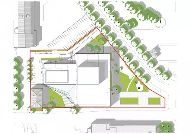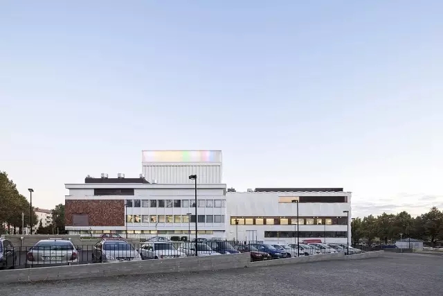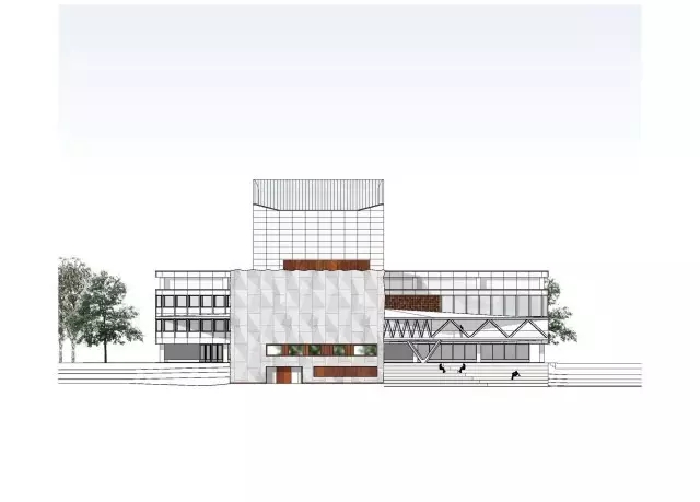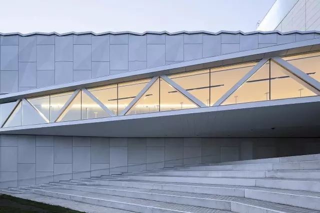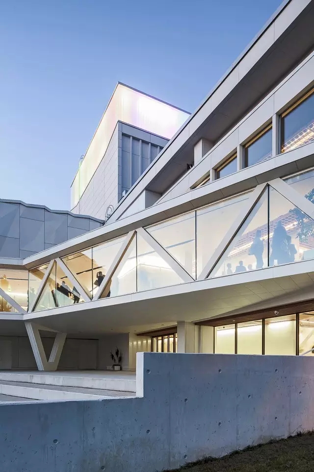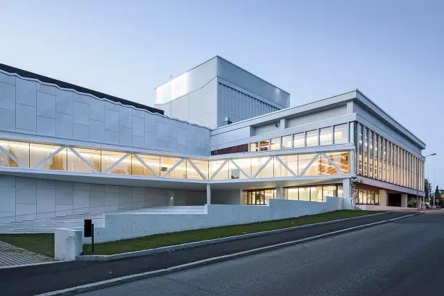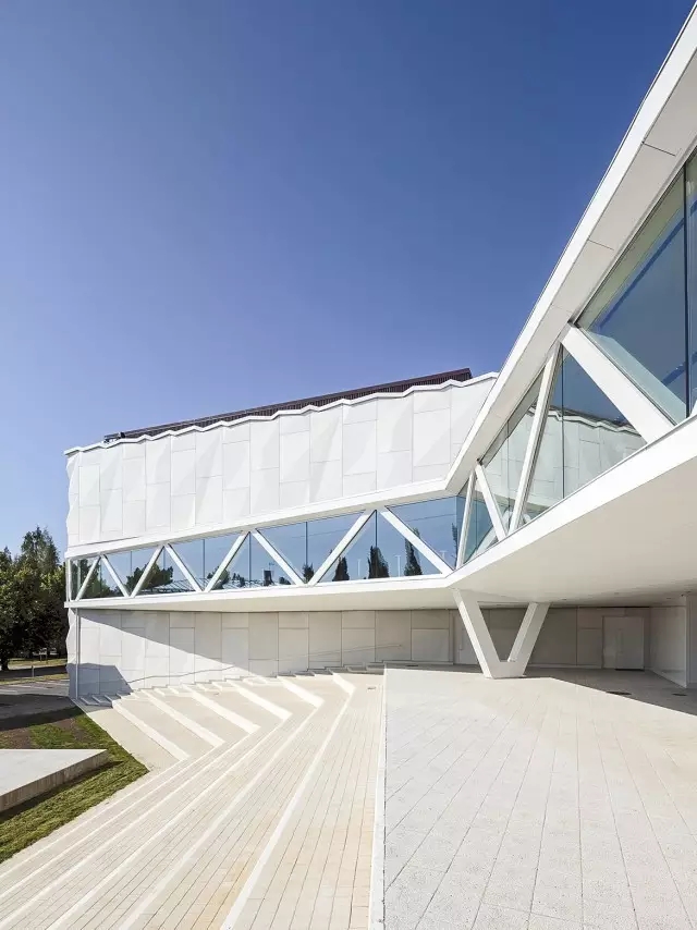 新剧院简洁的体量上覆盖着永恒而美丽的折面白色混凝土板,与老剧院的白色混凝土板,玻璃以及陶土砖形成相得益彰的并存效果。