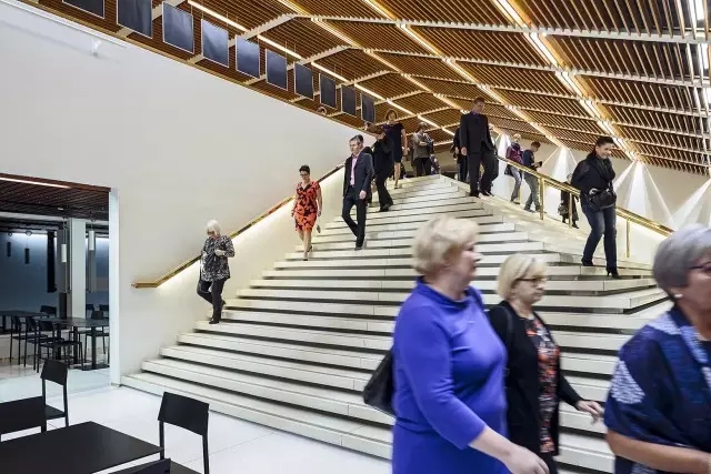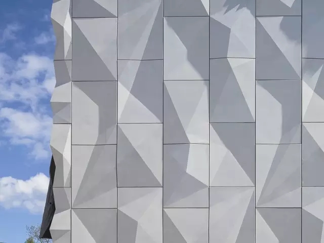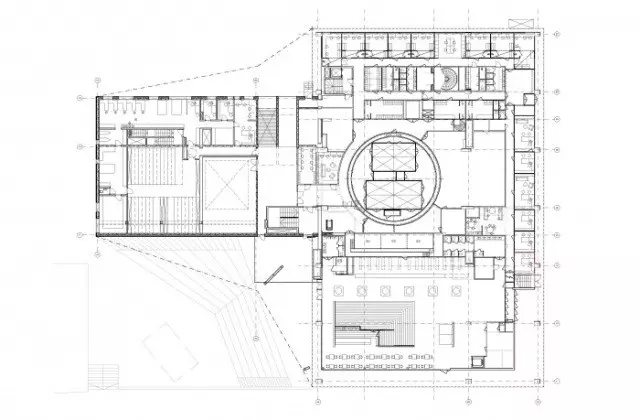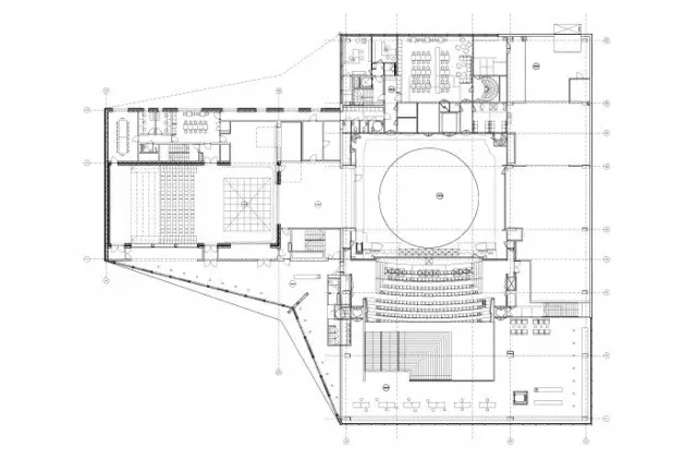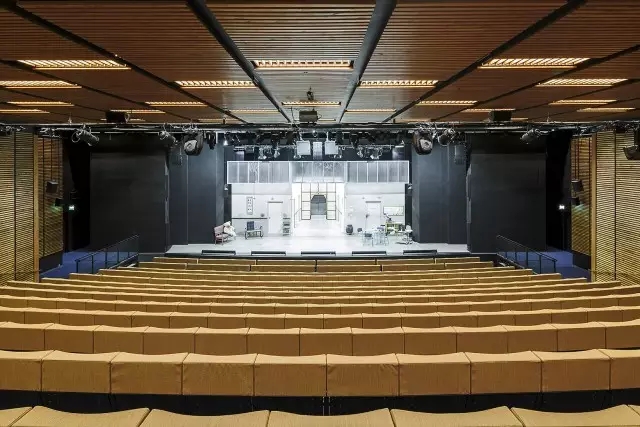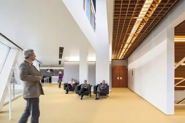 新体之中的小剧院墙面也采用了语言类似的折面板,为室内营造出优秀的音效。