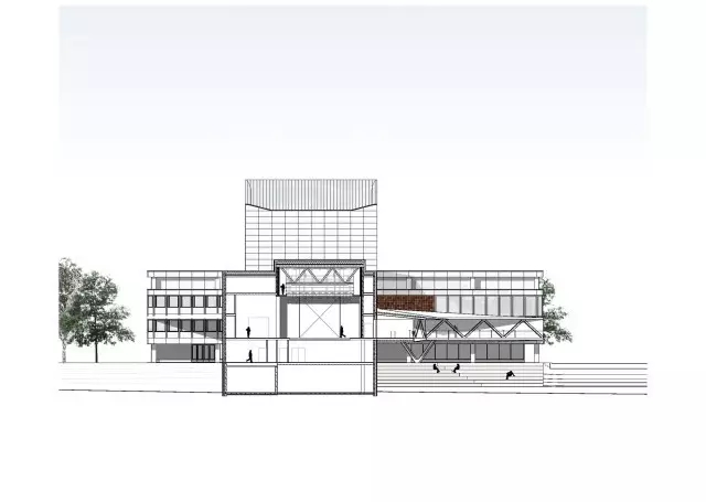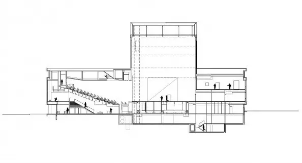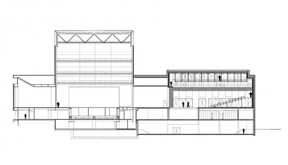 扩张工程实际上是将一个简单的矩形体垂直坐落于现有的体积上。新舞台连接到主舞台,就像是横版的舞台塔。