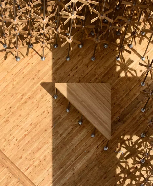 “能量亭(风车)”是一个由竹子,不锈钢杆件,木材和抛光的铝材建造的一个自立式结构。通过实心钢支架和结构化“地锚”进行支撑。整个亭子重约9吨,高约三米,占地64平方米。