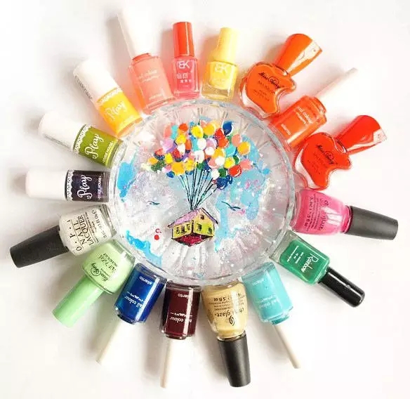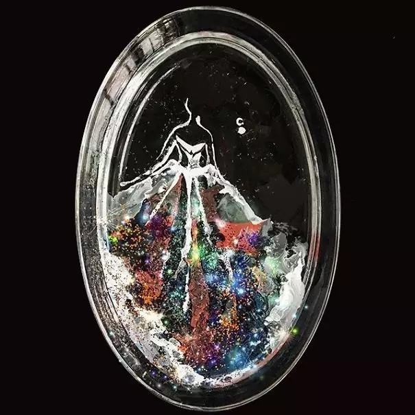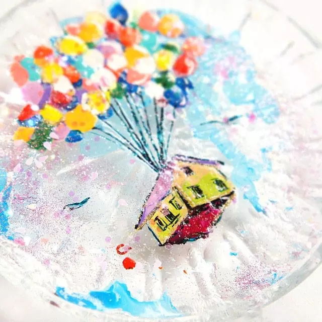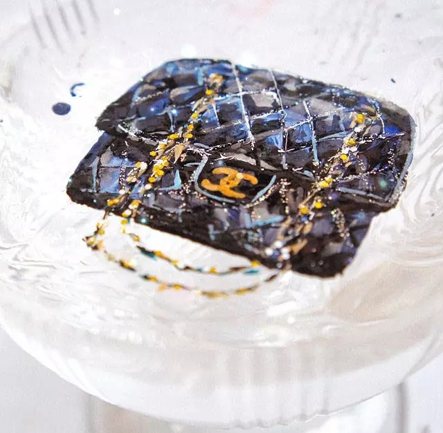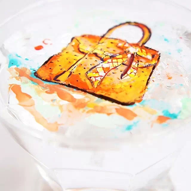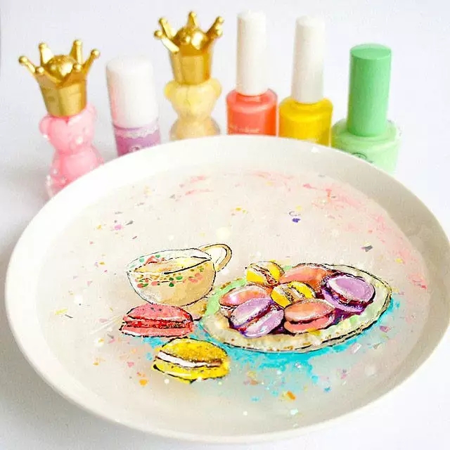 除了在水彩纸上画出梦幻华服,Chan Clayrene利用了指甲油质地较轻能浮在水面的特点,在碗里画出了各种好吃的好玩的东西,比如马卡龙点心,一杯咖啡,包包,甚至动画场景。