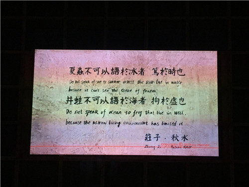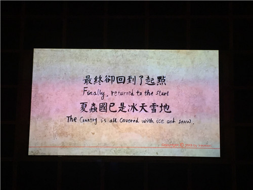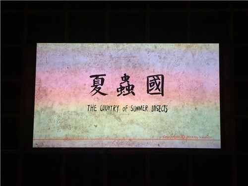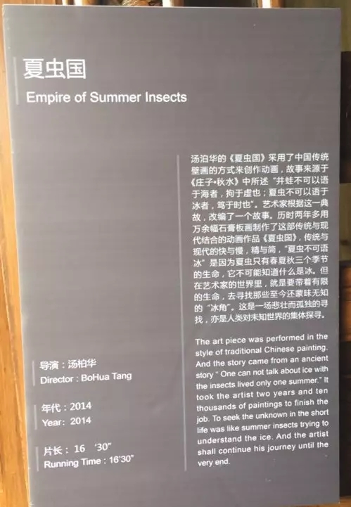 汤泊华的《夏虫国》采用了中国传统壁画的方式来创作动画,故事来源于《庄子·秋水》中所述“井蛙不可以语于海者,拘于虚也;夏虫不可以语于冰者,笃于时也”。艺术家根据这一典故,改编了一个故事。历时两年多用万余幅石膏板画制作了这部传统与现代结合的动画作品《夏虫国》,传统与现代的快与慢,精与简,“夏虫不可语冰”是因为夏虫只有春夏秋三个季节的生命,它不可能知道什么是冰。但在艺术家的世界里,就是要带着有限的生命,去寻找那些至今还蒙昧无知的“冰角”。这是一场悲壮而孤独的寻找,亦是人类对未知世界的集体探寻。