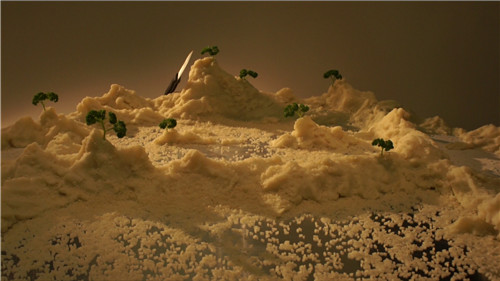 宋冬  作品简介:煞风景(雨米皴)A Blot on the Landscape - Rain and Rice Stroke, 2010Video 录像running time:5minutes 30seconds。
