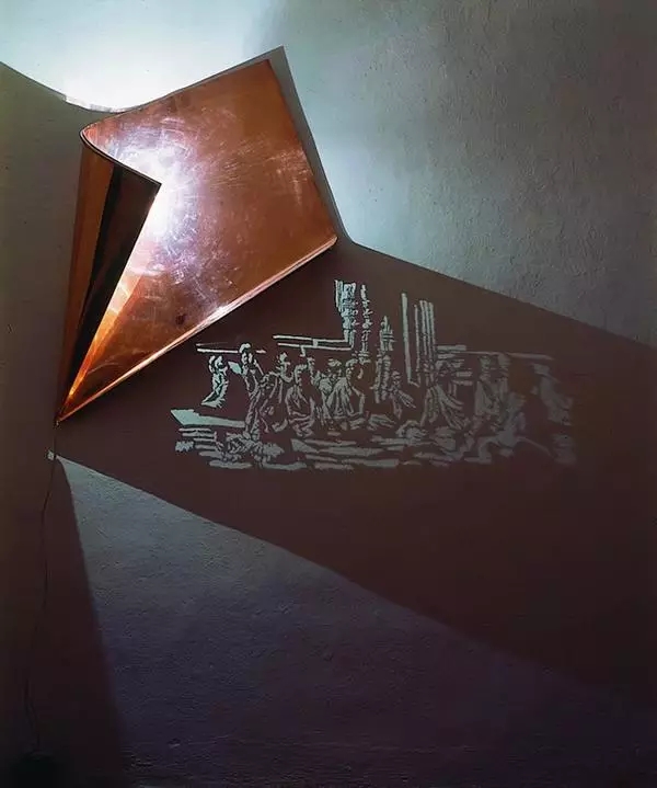 即使是最细微的变化,在光的投射之下也会出现绝大的差异,Fabrizio Corneli用类似的概念做出一系列投影作品。光线和铜金属片相互作用,缺一不可,在不开灯的情况下,铜片上的镂空线条看起来甚至有些不明所以,等到灯光一亮,作品的力量才能完全展现出来。
