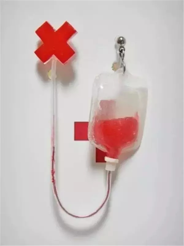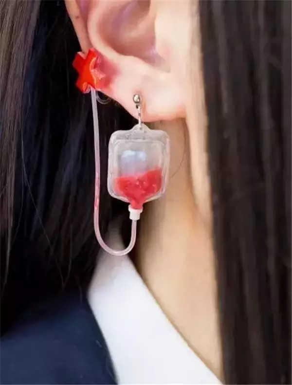 输液包形状的耳环。听说打耳洞很疼,那来输点血吧。