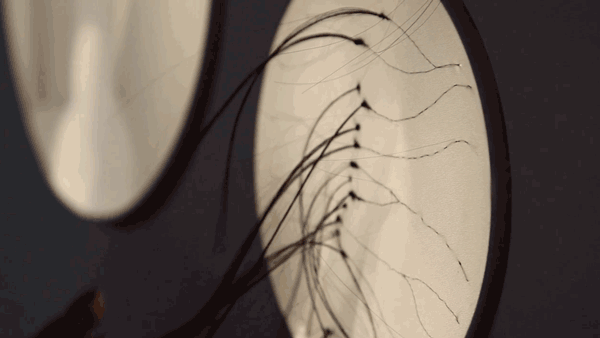 在着手去做之前,我反复考虑和设计了5个月之久,希望能找到一种更为自然的方式,来表达情感上的依附。静电是最常见的物理现象,它需要观众皮肤的触碰才能够发生。头发缓缓吸附的状态,和生物的形态很像。而且它不只是会吸附,有时还会“躲开”触碰者的手。这和人情感的状态也很相似。我希望这件作品不仅仅是私人的表达,也能够引起观众情感的共鸣。