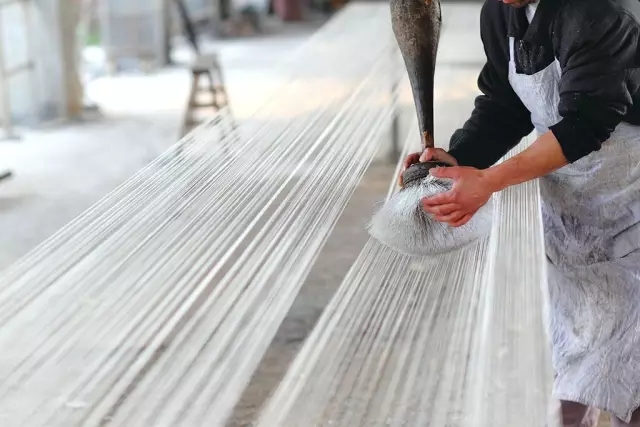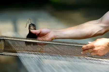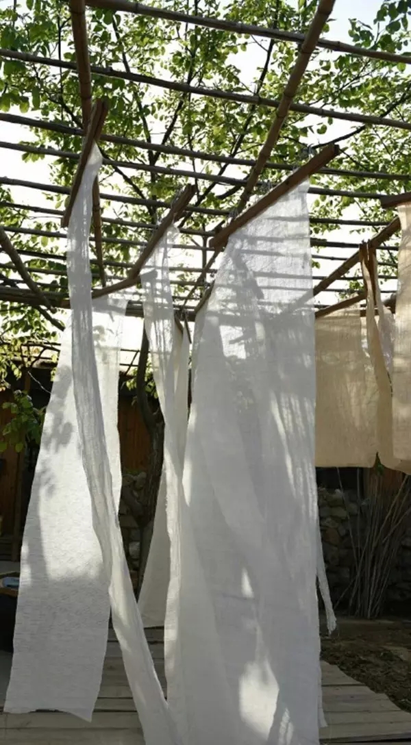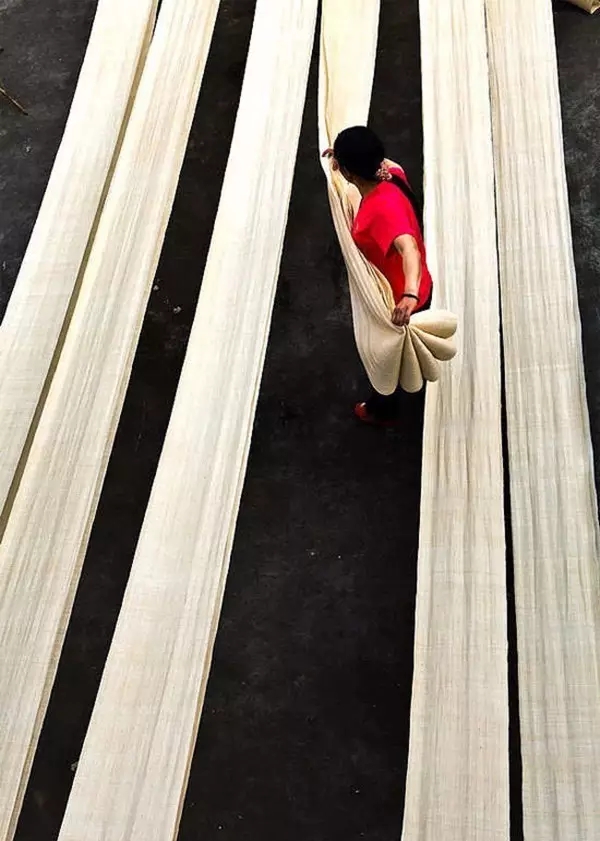 绩纱尽为女工,绩纱时将经上述自然漂白后的苎麻,撕开成片,卷成一缕缕,放入清水盆中,然后用手指梳成一根根苎麻细丝,放在大腿股上,用手捻接成细小麻纱线,再卷成如茧状纱绽一样小团缕。