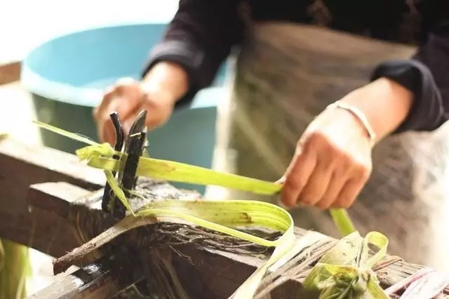 将苎麻砍下,去掉叶子,剥下茎皮,就可得到淡青色的苎麻纤维。