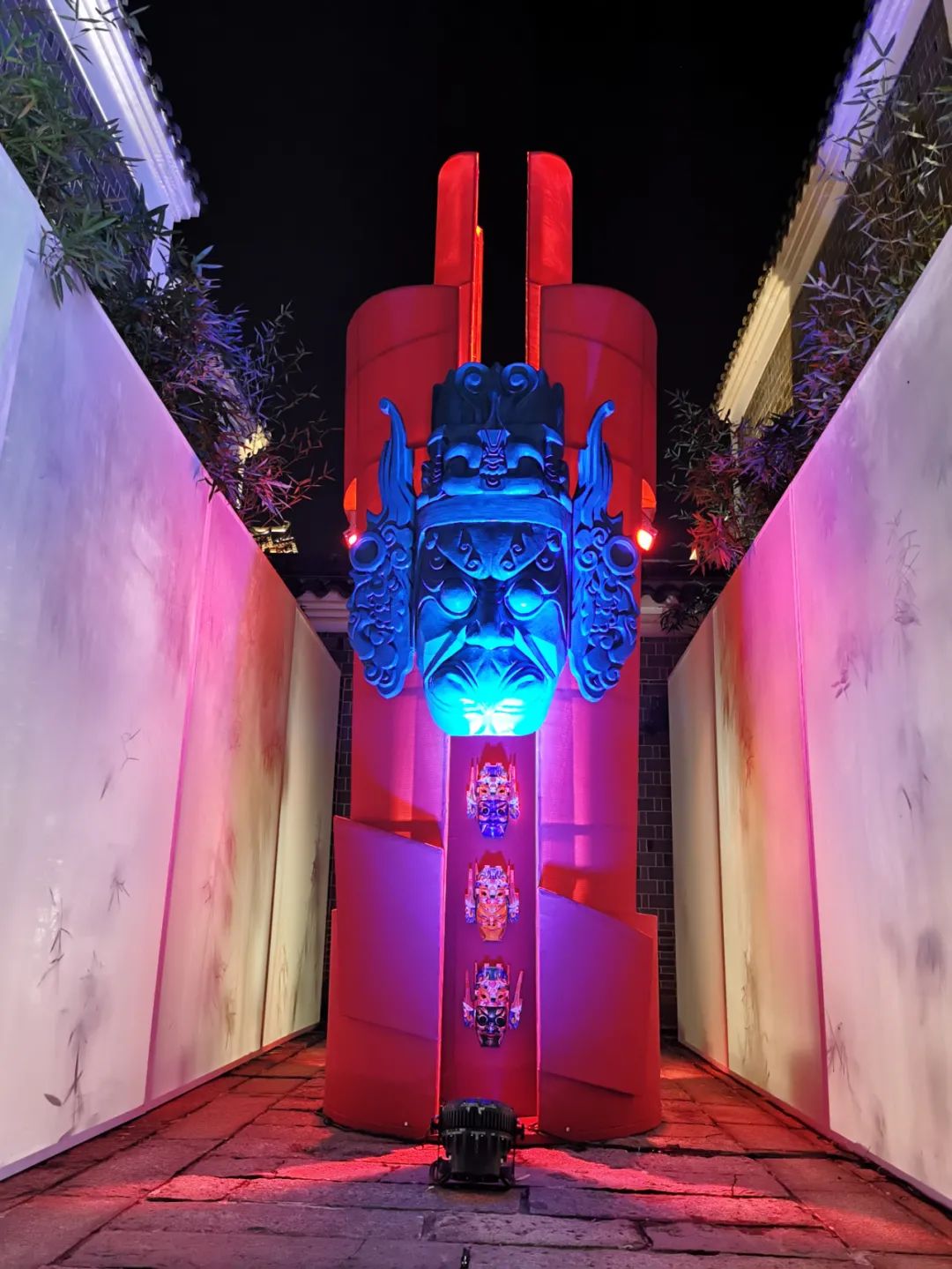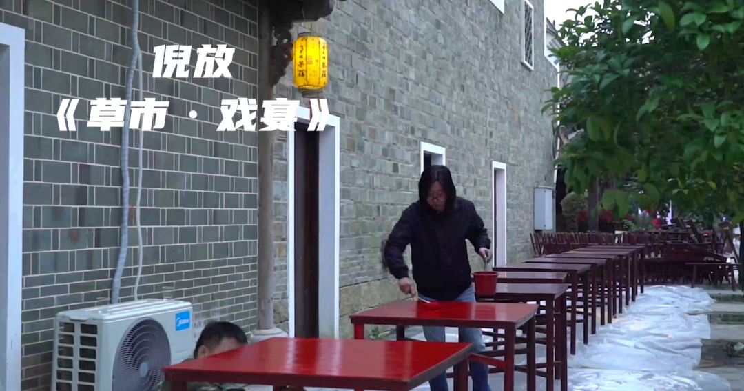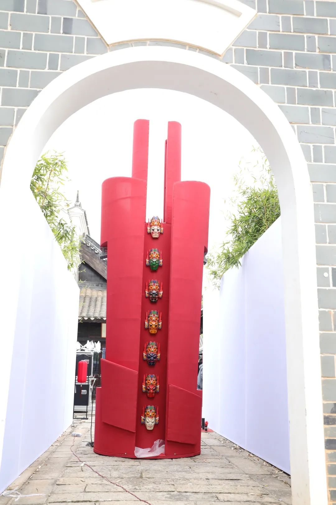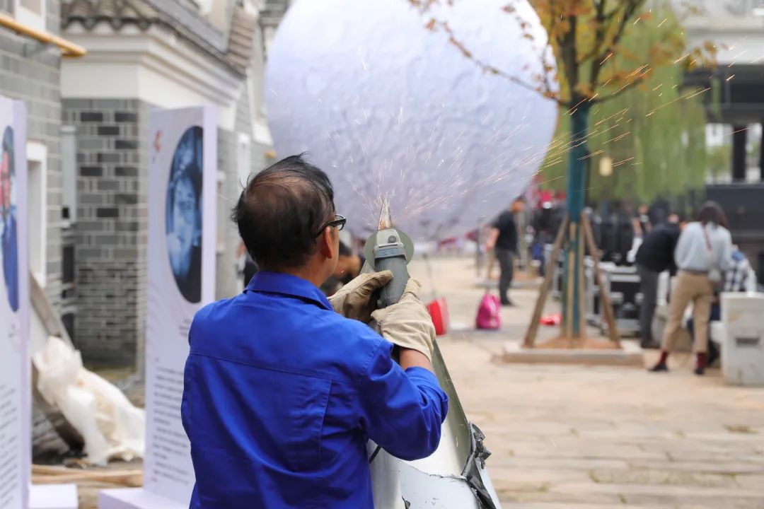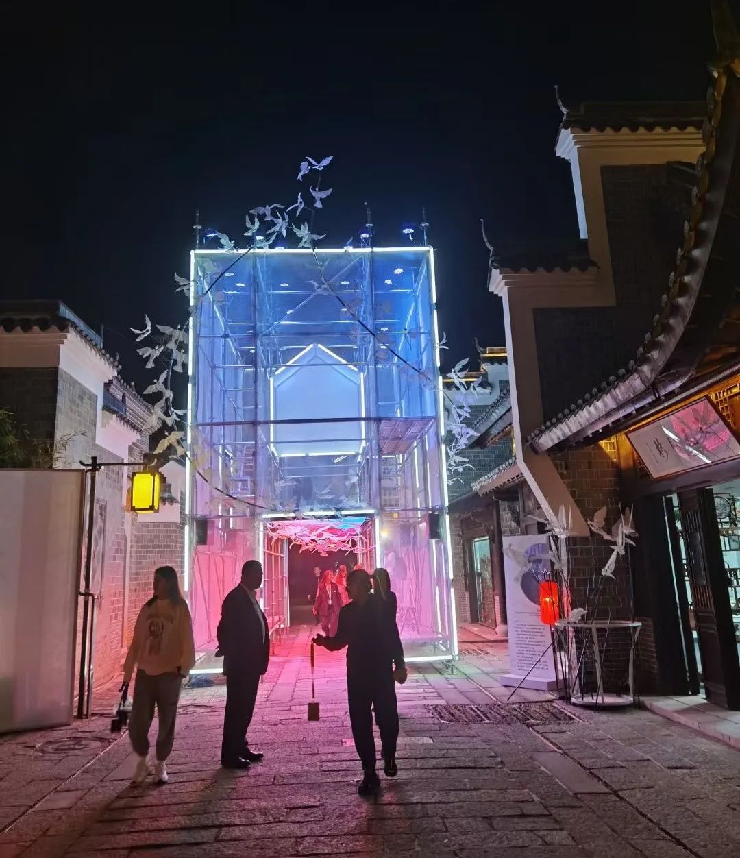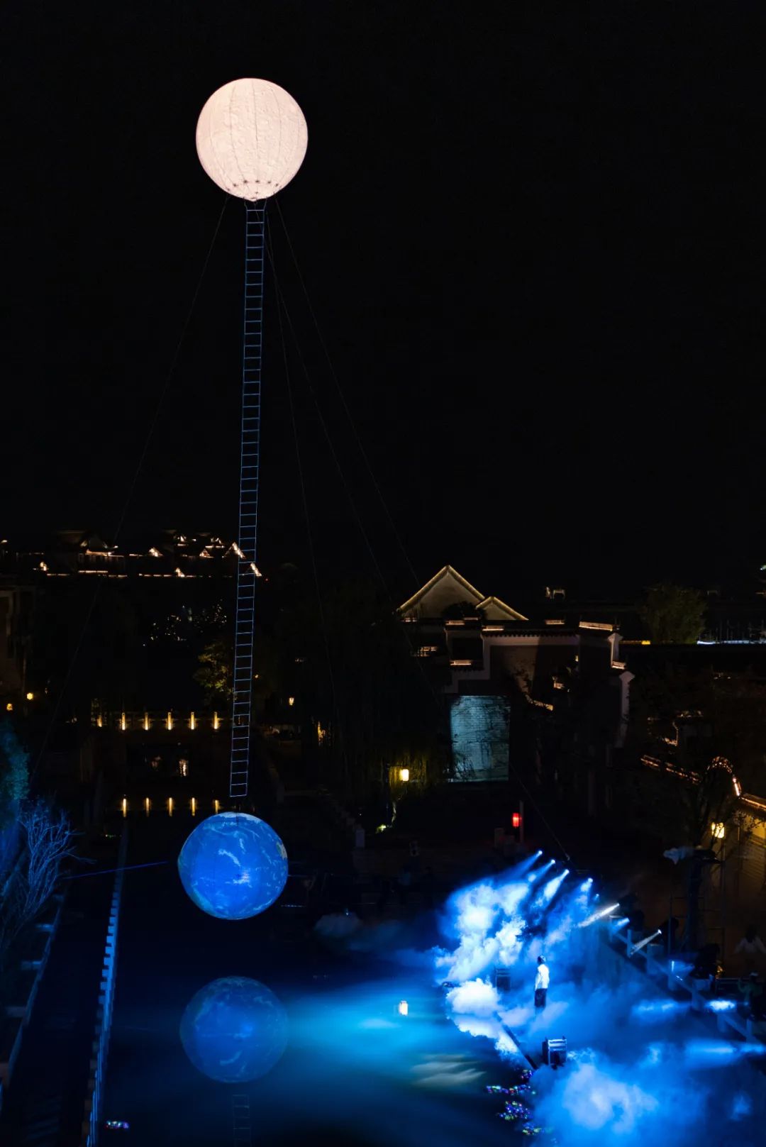 徐丹的《凝固的风景》,以荒诞雕塑的星球为外壳包裹戏剧模型,游客可在不同孔洞中看到时间流动下的“凝固”风景;倪放的《草市·戏宴》,在草市摆上长桌戏宴,展示戏剧的民间性与世俗性。