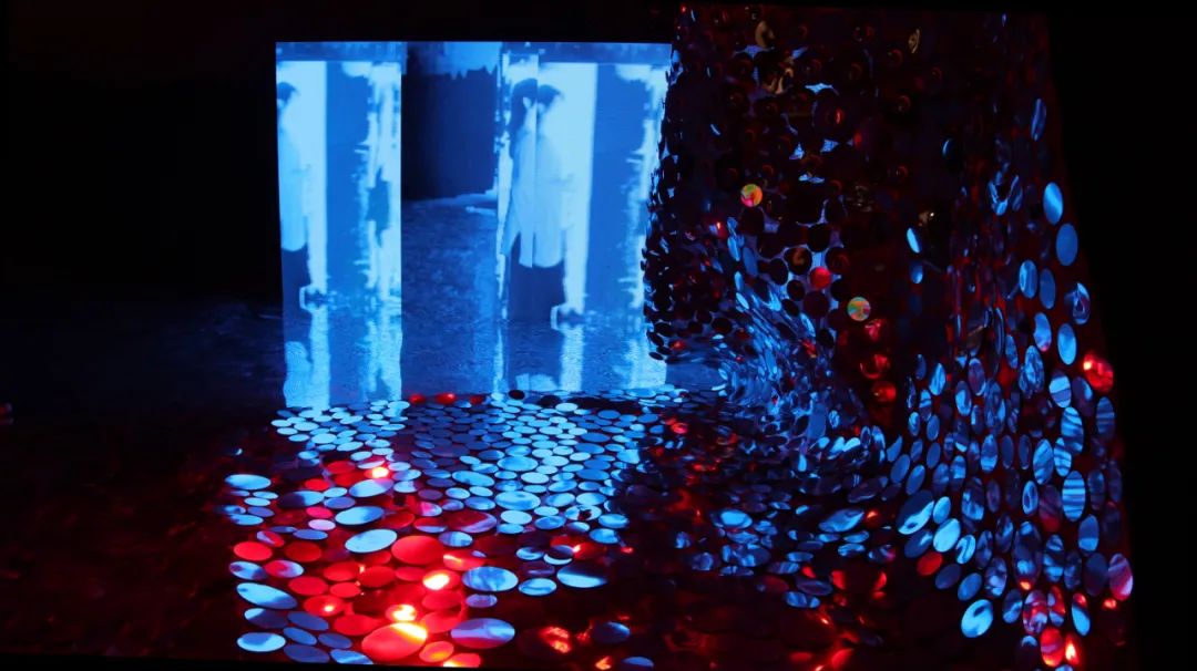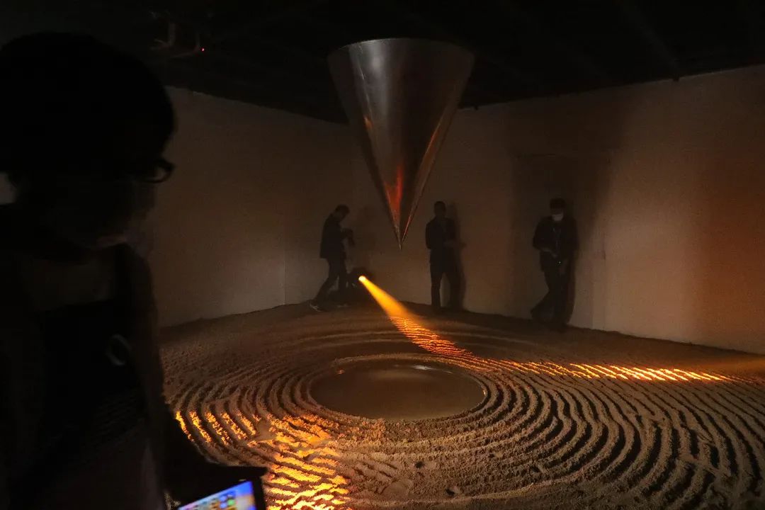 钟秋蓉的《傩》,呈现古老文化的神秘气氛;史军亮梦幻般的《鸽子》、反映疫情特殊环境下的情境,极具象征性意味。潘晓平的《圆·聚》《启·合》,用土与水堆叠成有共同原点的同心圆状态,通过新媒体影像呈现“聚是一团火,散是满天星”的意境。