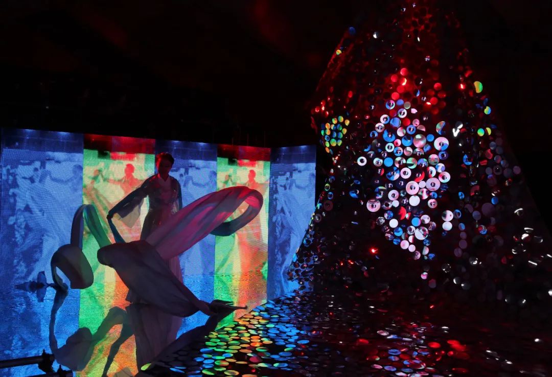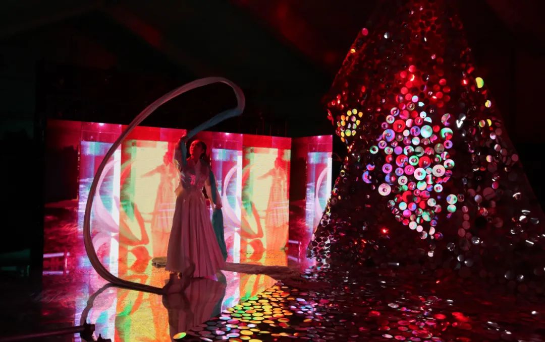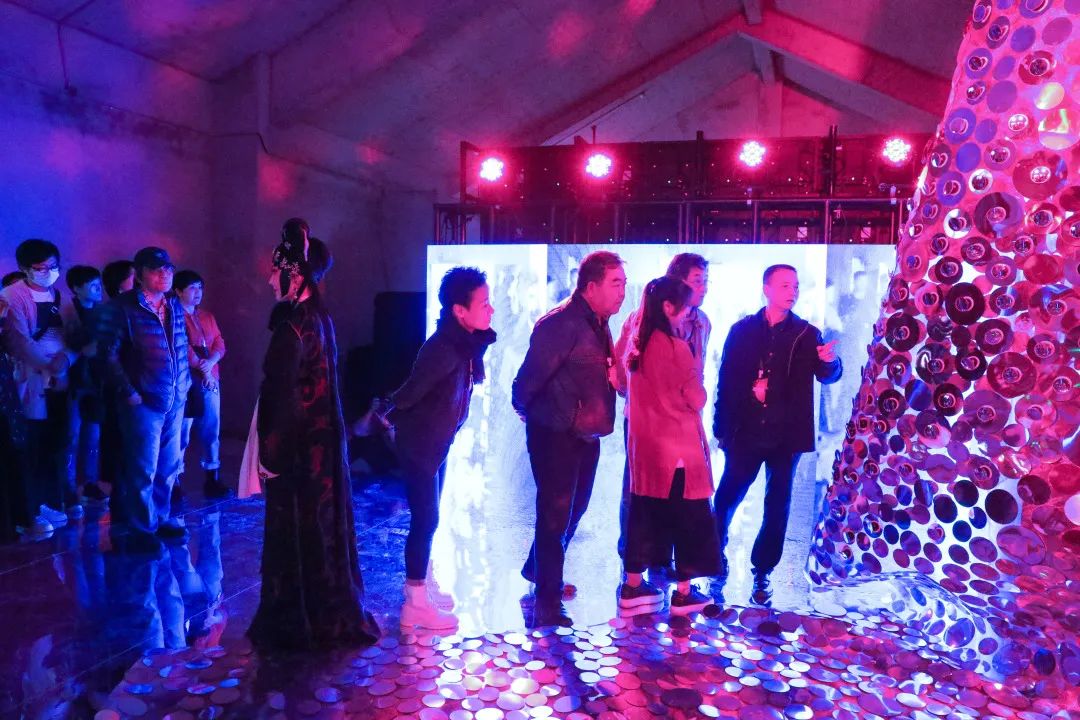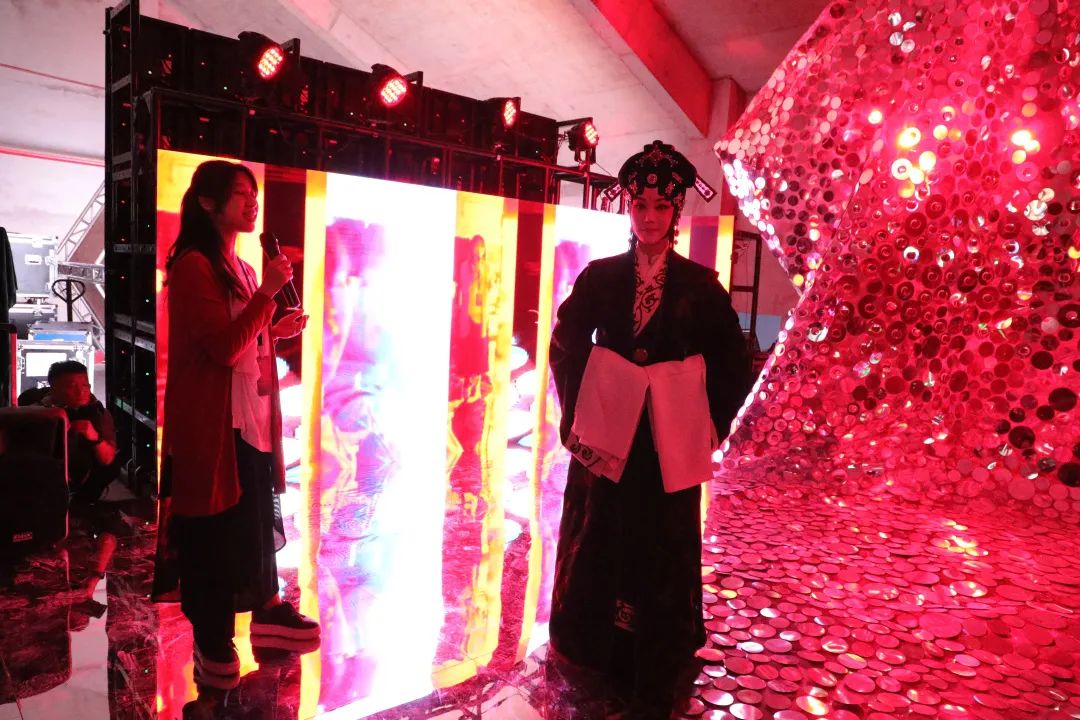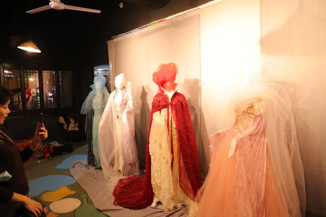廖宇耕的《万花筒》,利用光反射的原理成像,万花筒犹如时空隧道, 参观人员可以走进去体验身临其境的视觉画面效果。林燕的《物与象》,观者可站在“布”前,重新感受不同视角的微妙之变化,在显而易见的表象上层层叠加另一个视角的信息,从而引发对眼前客观事物的新的理解和思考;范丛博的《缘起·圆梦》,选取了音乐剧场《真爱·梁祝》、音乐剧《白蛇惊变》中的五款造型,呈现体验式观展模式;江霞的《穿越与体验》,将传统戏曲造型艺术在非演出空间零距离呈现,使戏曲“走近”观众、“走进”市井。