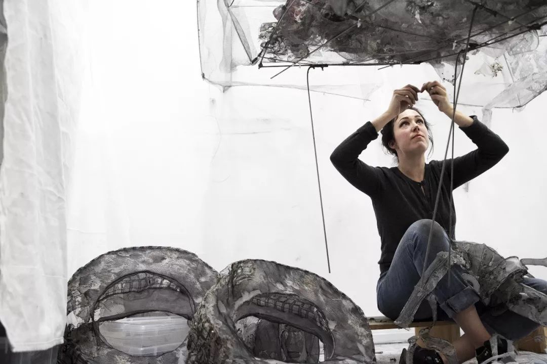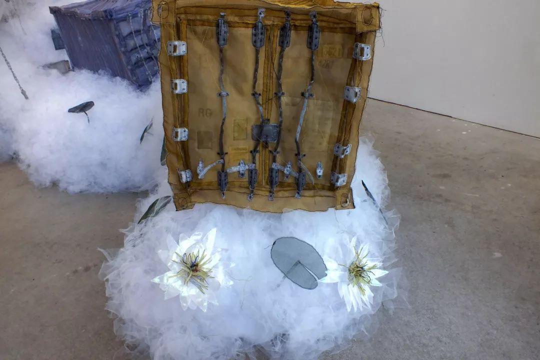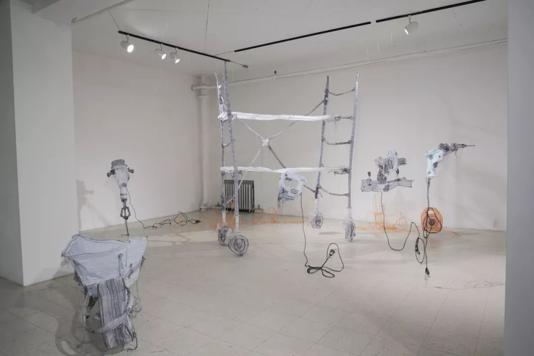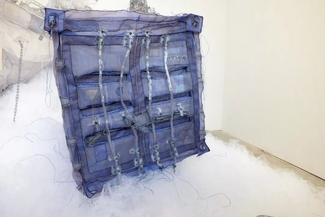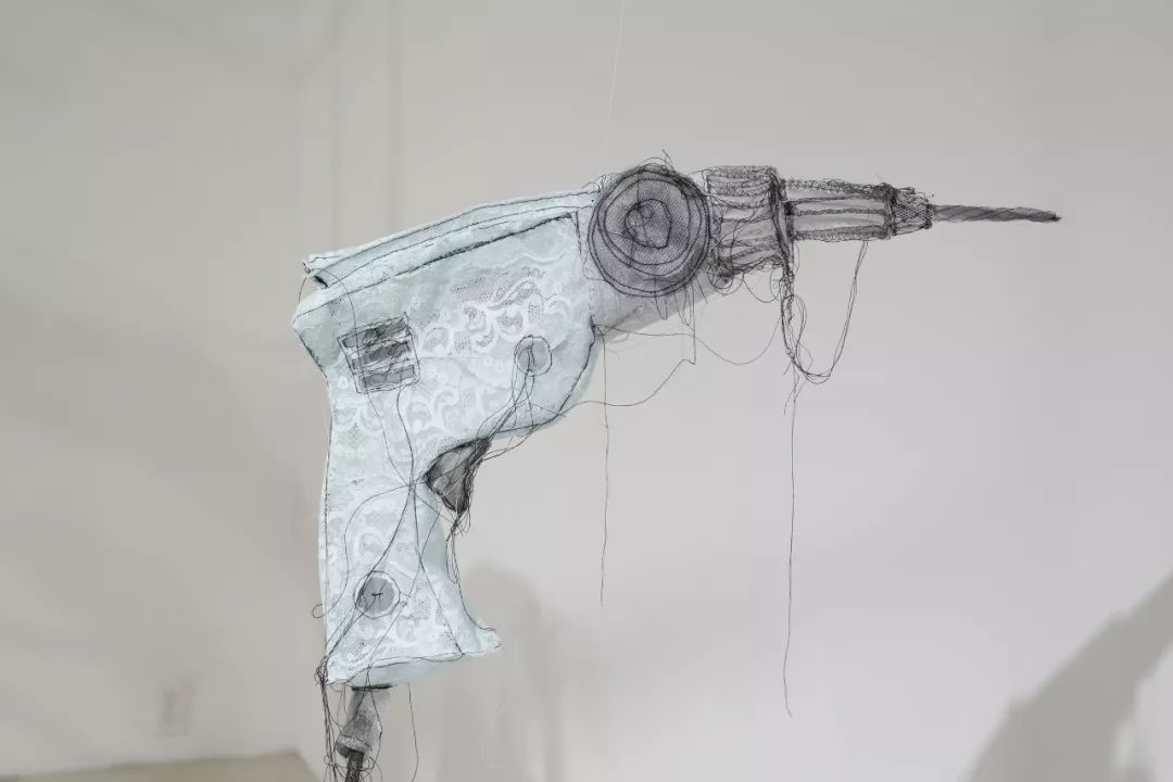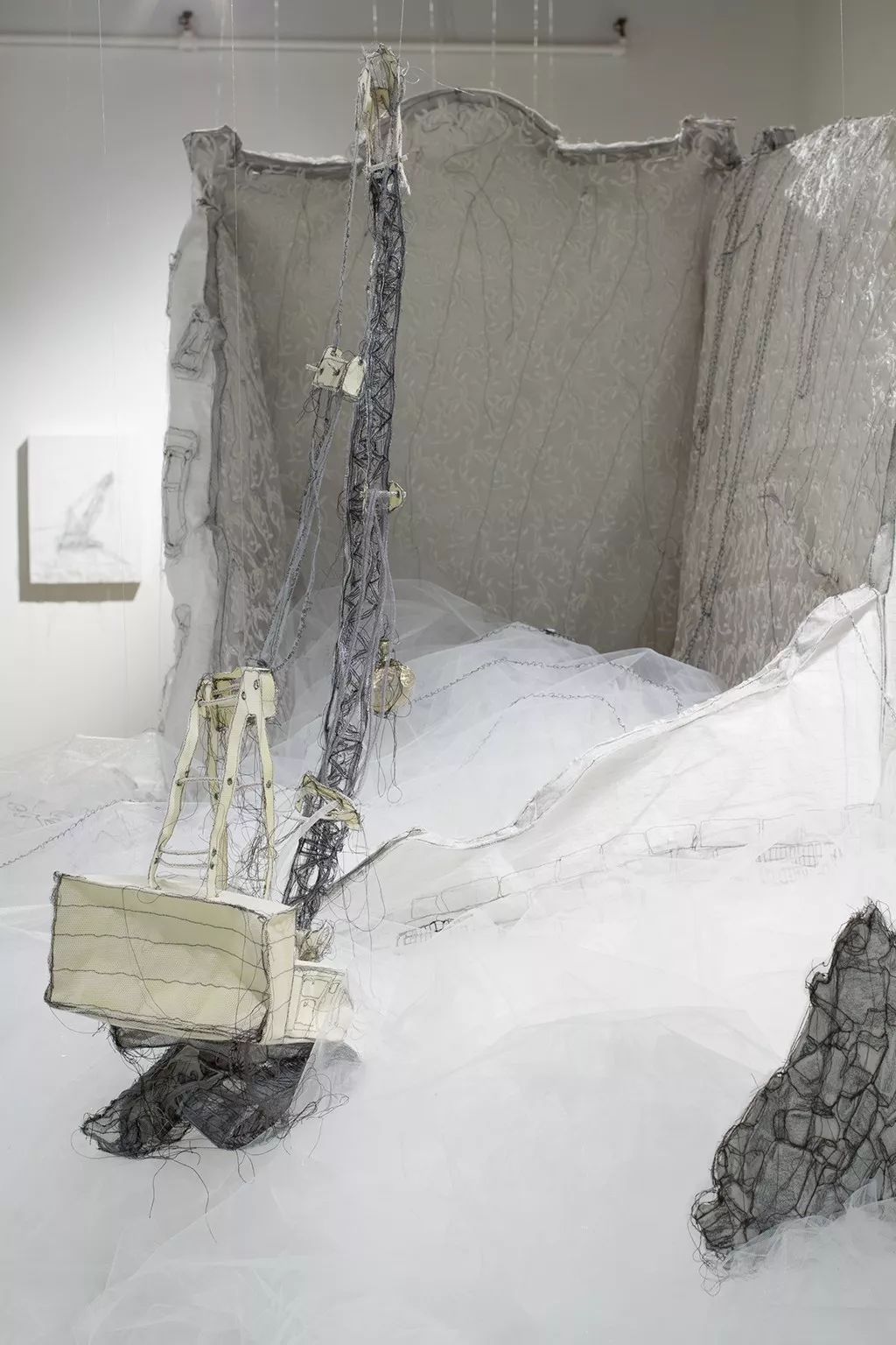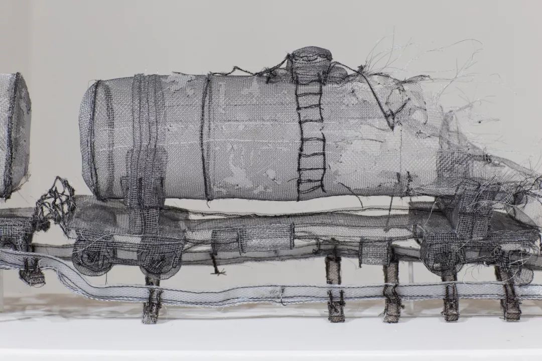 蒙特利尔纺织品艺术家Jannick Deslauriers运用丝绸、金属丝和薄纱等,缝制出各种精致的机器。她使用的每一种面料都是透明的,通过这种形式寓意这些隐藏在常用物品背后的政治。她的最新作品之一“Sentence, souffle et linceul”是一辆被毁汽车的1:1尺寸复制品。半透明的车辆靠右倾,它以一种破碎的形态,通过柔软和易于操纵的材料组成并进一步被夸大。
