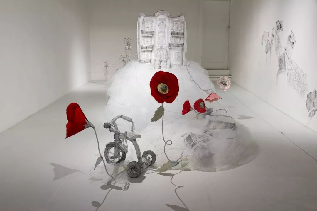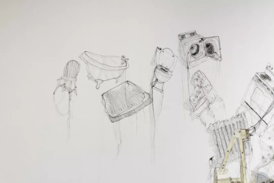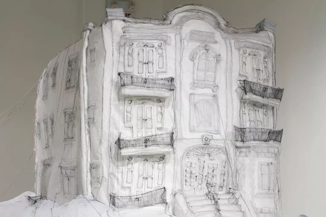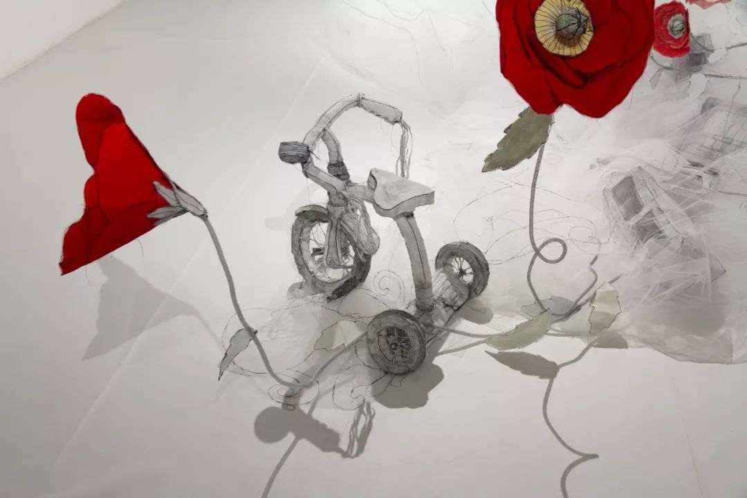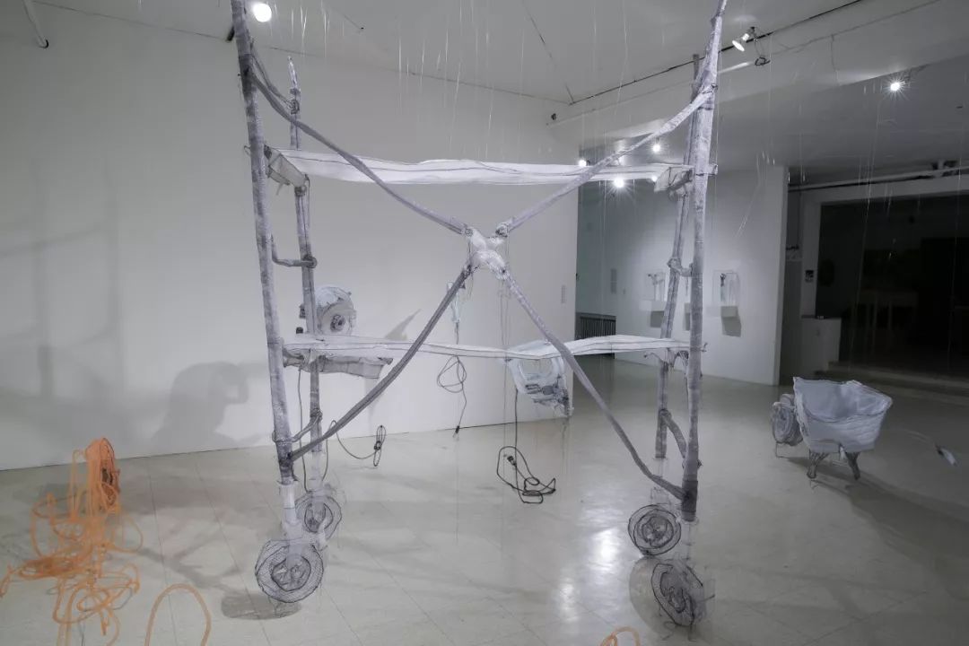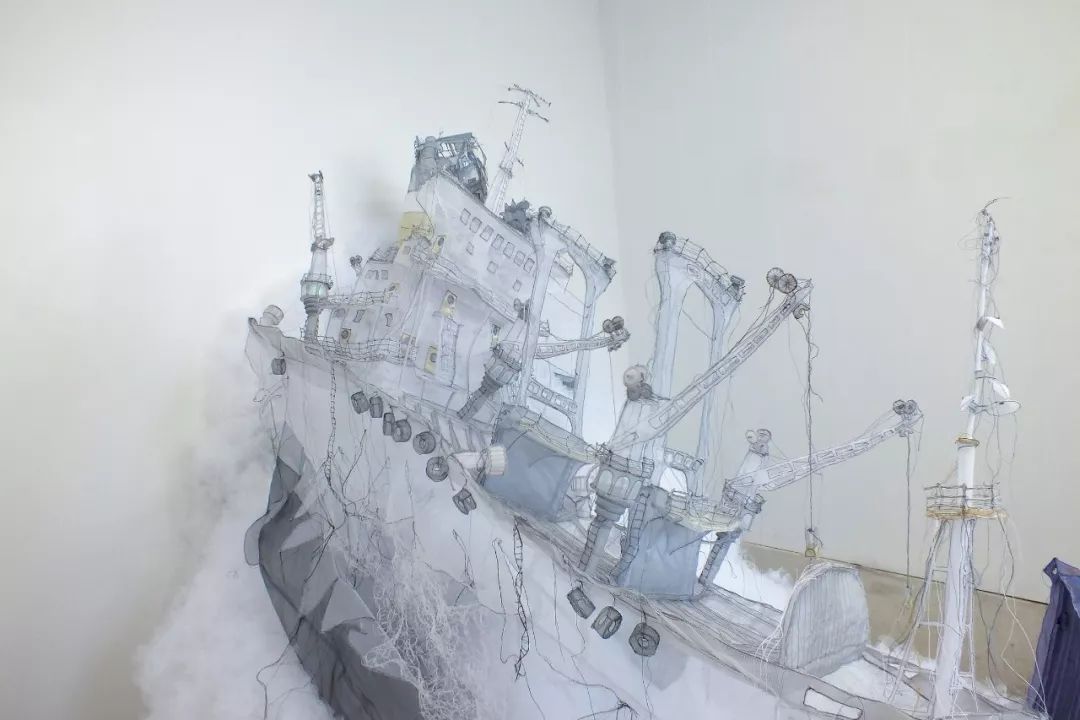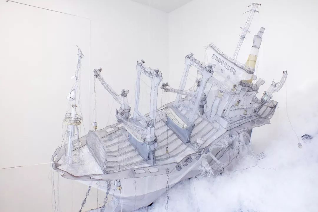 蒙特利尔纺织品艺术家Jannick Deslauriers运用丝绸、金属丝和薄纱等,缝制出各种精致的机器。她使用的每一种面料都是透明的,通过这种形式寓意这些隐藏在常用物品背后的政治。她的最新作品之一“Sentence, souffle et linceul”是一辆被毁汽车的1:1尺寸复制品。半透明的车辆靠右倾,它以一种破碎的形态,通过柔软和易于操纵的材料组成并进一步被夸大。