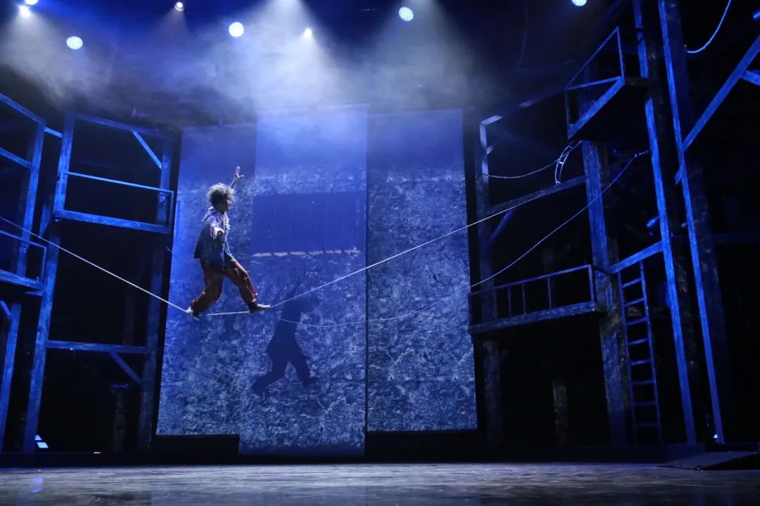 《春望·小萝卜头》经过编导的精心编排,以码头遇险、狱中抗争、集市协助、传递情报、美好梦想这几部分,串联起了小萝卜头和狱友们积极参与地下党的事业并最终献身的一生。在这一过程中,将各种杂技艺术,如爬杆、钻圈、绸吊、皮条、蹬人、空竹、中幡、舞狮、转盘、飞叉、手抛技、软钢丝、集体造型等有机地融入到了剧情中,并借助这些技艺呈现出时而跌宕紧张、时而充满谐趣的剧情。以剧带技,充分地发挥了戏剧的叙事性,克服了杂技作为造型艺术,弱于叙事和抒情的局限性。
