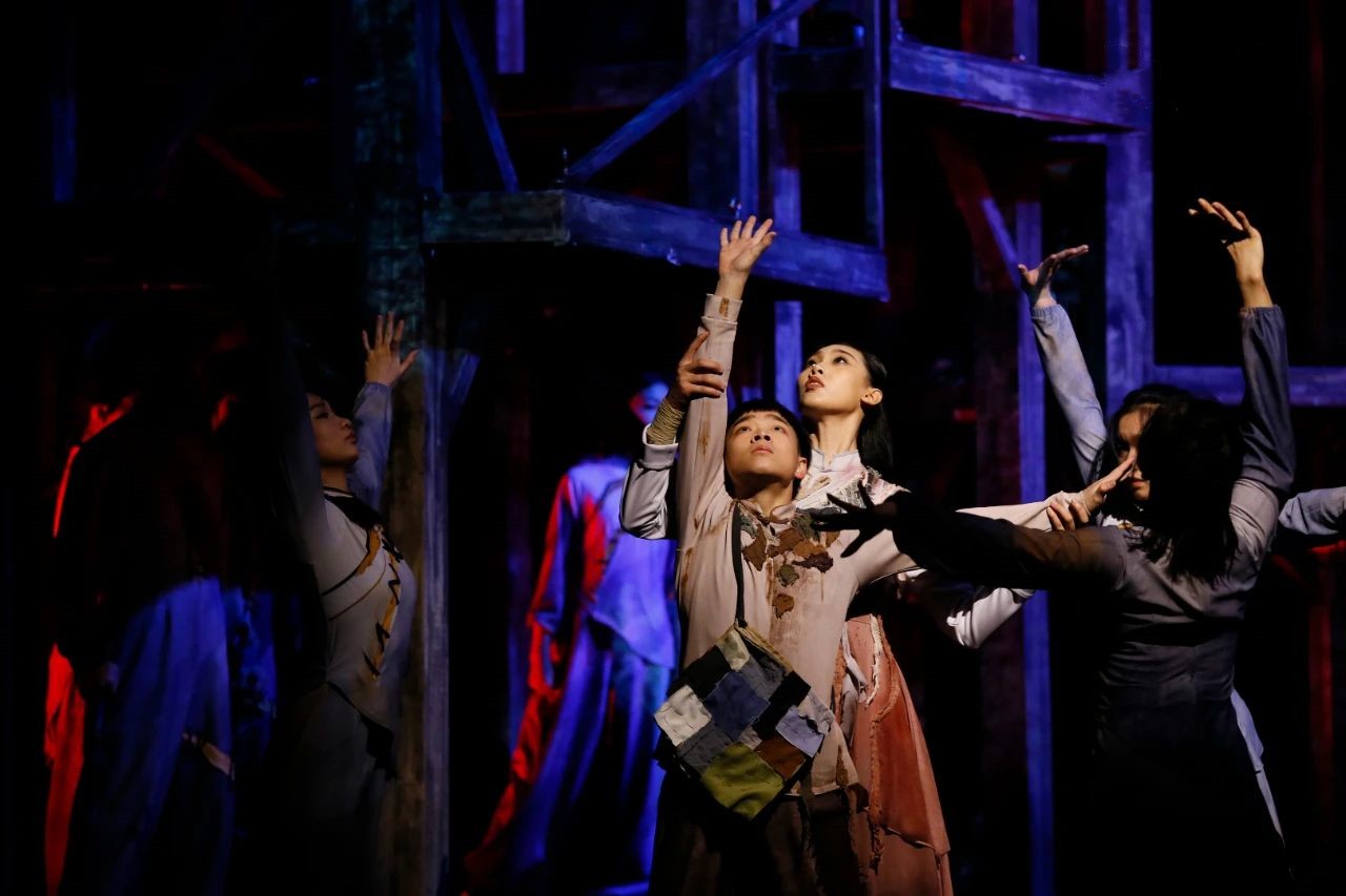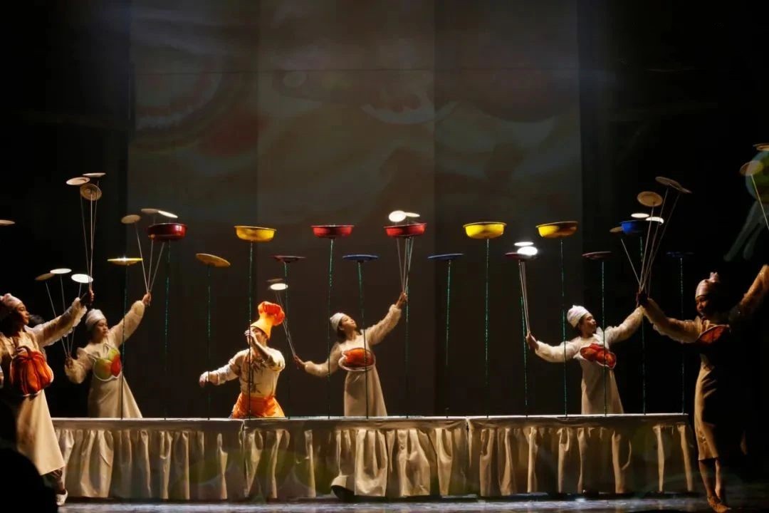 该剧不但使用了投屏技术来介绍故事、交代剧情,还使用投影、音响等多媒体制作,从视觉和听觉上努力还原剧中的场景,将瓢泼大雨、人来人往的集市、汹涌的嘉陵江呈现在观众面前,配合自动化的杂技道具,给观众以身临其境的感受。这些技术在展现人物内心世界、烘托剧情和气氛中也起到了画龙点睛的作用。如小萝卜头在狱中向黄将军学习写字时,剧场上随之产生一连串“中国”的字符,以及自由欢欣的人间百态;再如漂浮在他梦境中的五彩城堡、精灵怪兽、珍馐美味,更是为小萝卜头冰冷的监狱生活注入斑斓的梦幻色彩。在新技术的烘托下,展现出一个普通孩子的天真烂漫与奇思妙想。同时,这些技术的使用是恰到好处的,并没有流于花哨和泛滥,从而造成喧宾夺主的后果。《春望·小萝卜头》的场景设置和技术使用精致而不豪华,混搭形式复杂而不芜杂,所有的表现形式都是为讲好故事、凸显技艺服务的,并没有损害杂技本身的艺术形式,妥当地处理了形式和内容谁主谁次的问题。