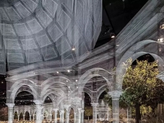 在酒店7000平方米的空间内,以古典建筑为灵感,使用丝网电线构建建筑体。电线从建筑上方的圆顶悬挂起来,丝丝构筑成半透明的柱子、拱门等建筑元素,呈现幽灵般的巨大环境外观,让人仿
