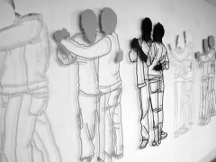 两个女孩和一只猫,他们隐藏在多层的纸人里,艺术家鼓励游客们从作品中将他们找出来,就像是在人群中寻找“走失”的身影一样。